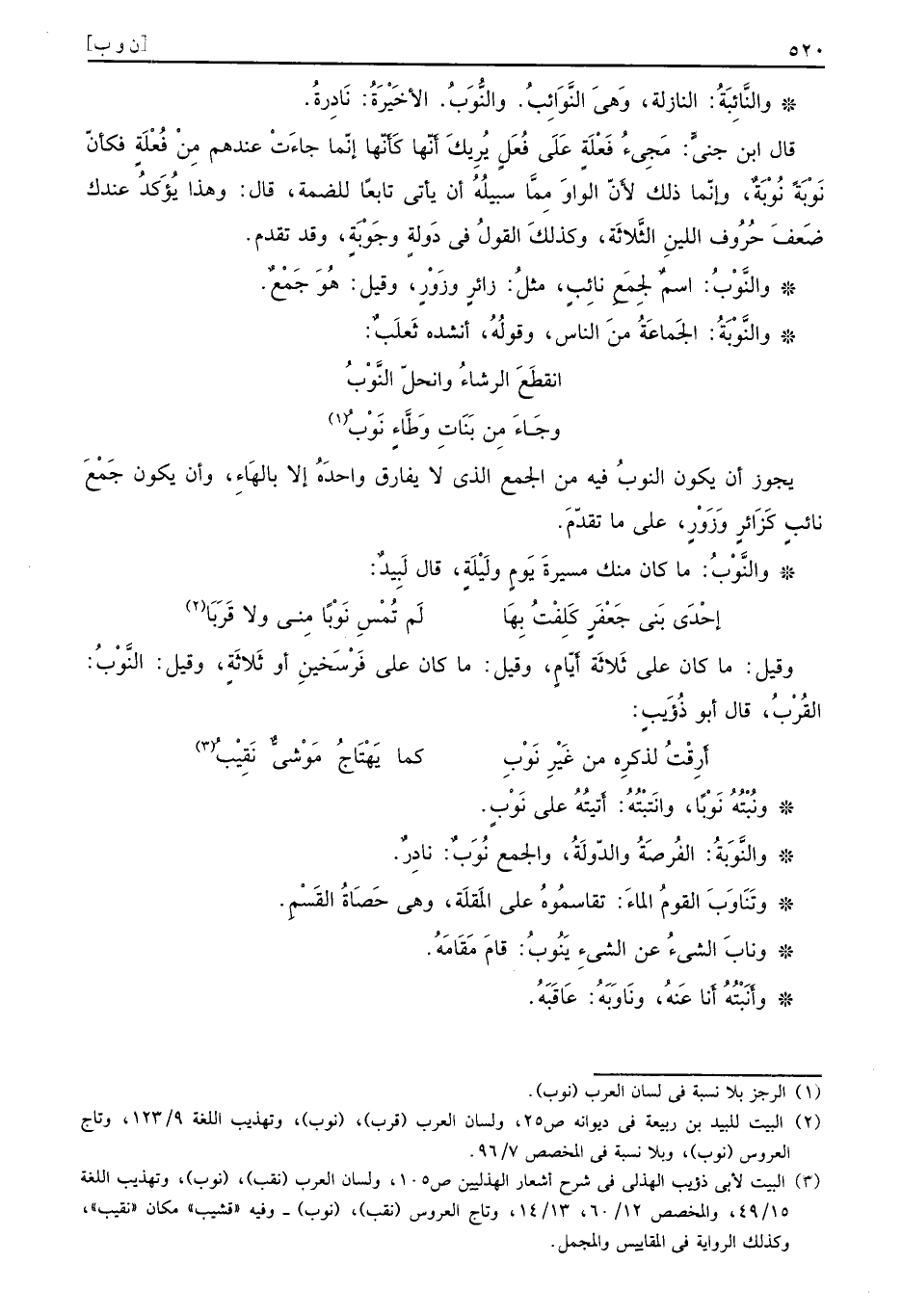 يجوز أن يكون النوبُ فيه من الجمع الذي لا يفارق واحدَهُ إلا بالهَاءِ وأن يكون جَمْعَ نائبٍ كَزَائرٍ وَزَوْرٍ على ما تقدّمَ والنَّوْبُ ما كان منك مسيرةَ يَومٍ ولَيْلَةٍ قال لَبيدٌ
