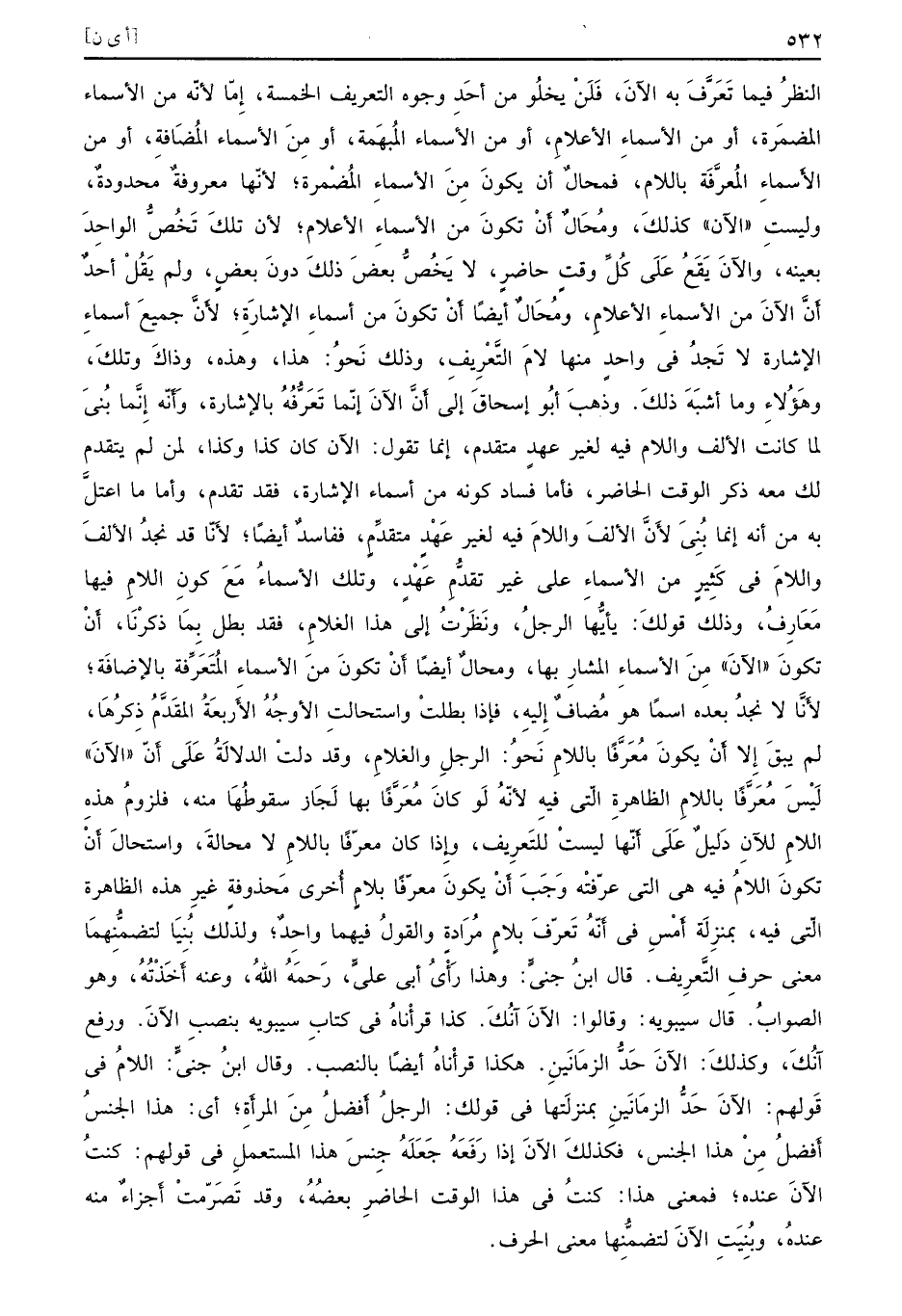 النظرُ فيما تَعَرَّفَ به الآنَ فَلَنْ يخلُو من أَحَدِ وجوه التعريف الخمسة إِمّا لأنّه من الأسماء المضمَرة أو من الأسماءِ الأعلامِ أو من الأسماء المُبهَمة أو مِنَ الأسماء المُضَافةِ أو من الأَسماءِ المُعرَّفَة باللام فمحالٌ أن يكونَ مِنَ الأسماءِ المُضْمرة لأنّها معروفةٌ محدودةٌ وليستِ الآن كذلكَ ومُحَالٌ أَنْ تكونَ من الأسماءِ الأعلام لأن تلكَ تَخُصُّ الواحِدَ بعنيه والآنَ يَقَعُ عَلَى كُلَّ وقتٍ حاضرٍ لا يَخُصُّ بعضَ ذلكَ دونَ بعضٍ ولم يَقُلْ أحدٌ أَنَّ الآنَ من الأسماءِ الأعلامِ ومُحَالٌ أيضًا أَنْ تكونَ من أسماءِ الإشارَةِ لأَنَّ جميعَ أسماءِ الإشارة لا تَجدُ في واحدٍ منها لامَ التَّعْرِيفِ وذلك نَحوُ هذا وهذه وذاكَ وتلكَ وهَؤُلاءِ وما أشبَهَ ذلكَ وذهبَ أبُو إسحاقَ إلى أَنَّ الآنَ إنّما تَعَرُّفُهُ بالإشارة وأَنّه إِنَّما بُنيَ لما كانت الألف واللام فيه لغير عهدٍ متقدم إنما تقول الآن كان كذا وكذا لمن لم يتقدم لك معه ذكر الوقت الحاضر فأما فساد كونه من أسماء الإشارة فقد تقدم وأما ما اعتلَّ به من أنه إنما بُنِيَ لأنَّ الألفَ واللامَ فيه لغير عَهْدٍ متقدِّمٍ ففاسدٌ أيضًا لأنّا قد نجدُ الألفَ واللامَ في كَثِيرٍ من الأسماءِ على غير تقدُّمٍ عَهْدٍ وتلك الأسماءُ مَعَ كونِ اللامِ فيها مَعَارِفُ وذلك قولكَ يأيُّها الرجلُ ونَظَرْتُ إلى هذا الغلامِ فقد بطل بِمَا ذكرْنَا أَنْ تكونَ الآنَ مِنَ الأسماءِ المشارِ بها ومحالٌ أيضًا أَنْ تكونَ من الأسماءِ المُتَعَرِّفة بالإضافَة لأنَّا لا نجدُ بعده اسمًا هو مُضافٌ إِليهِ فإذا بطلتْ واستحالتِ الأوجُهُ الأَربعَةُ المقَدَّمُ ذِكرُهَا لم يبقَ إِلا أَنْ يكونَ مُعَرَّفًا باللامِ نَحوُ الرجلِ والغلامِ وقد دلتْ الدلالَةُ عَلَى أَنّ الآنَ لَيْسَ مُعَرَّفًا باللامِ الظاهرةِ الّتي فيهِ لأنّهُ لَو كانَ مُعَرَّفًا بها لَجَاز سقوطُهَا منه فلزومُ هذه اللامِ للآنِ دَليلٌ عَلَى أَنَّها ليستْ للتَعريفِ وإِذا كان معرّفًا باللامِ لا محالةَ واستحالَ أَنْ تكونَ اللامُ فيه هي التي عرّفْته وَجَبَ أَنْ يكونَ معرّفًا بلامٍ أُخرى مَحذوفةٍ غيرِ هذه الظاهرة الّتي فيه بمنزِلَة أَمْسِ في أنّهُ تَعرّفَ بلامٍ مُرَادةٍ والقولُ فيهما واحِدٌ ولذلك بُنِيَا لتضمُّنِهمَا معنى حرفِ التَّعرِيف قال ابنُ جنيٍّ وهذا رَأْيُ أبي عليٍّ رَحمَهُ اللهُ وعنه أَخَذْتُهُ وهو الصوابُ قال سيبويه وقالوا الآنَ آنُكَ كذا قرأْناهُ في كتابِ سيبويه بنصبِ الآنَ ورفع آنُكَ وكذلكَ الآنَ حَدُّ الزمَانَينِ هكذا قرأْناهُ أيضًا بالنصب وقال ابنُ جنيٍّ اللامُ في قَولهم الآنَ حَدُّ الزَمَانَينِ بمنزلَتها في قولك الرجلُ أَفضلُ مِنَ المرأَةِ أي هذا الجنسُ أفضلُ مِنْ هذا الجنس فكذلكَ الآنَ إذا رَفَعَهُ جَعَلَهُ جِنسَ هذا المستعملِ في قولهم كنتُ الآنَ عنده فمعنى هذا كنتُ في هذا الوقت الحاضرِ بعضُهُ وقد تَصَرّمتْ أَجزاءٌ منه عندهُ وبُنِيَتِ الآنَ لتضمُّنِها معنى الحرف