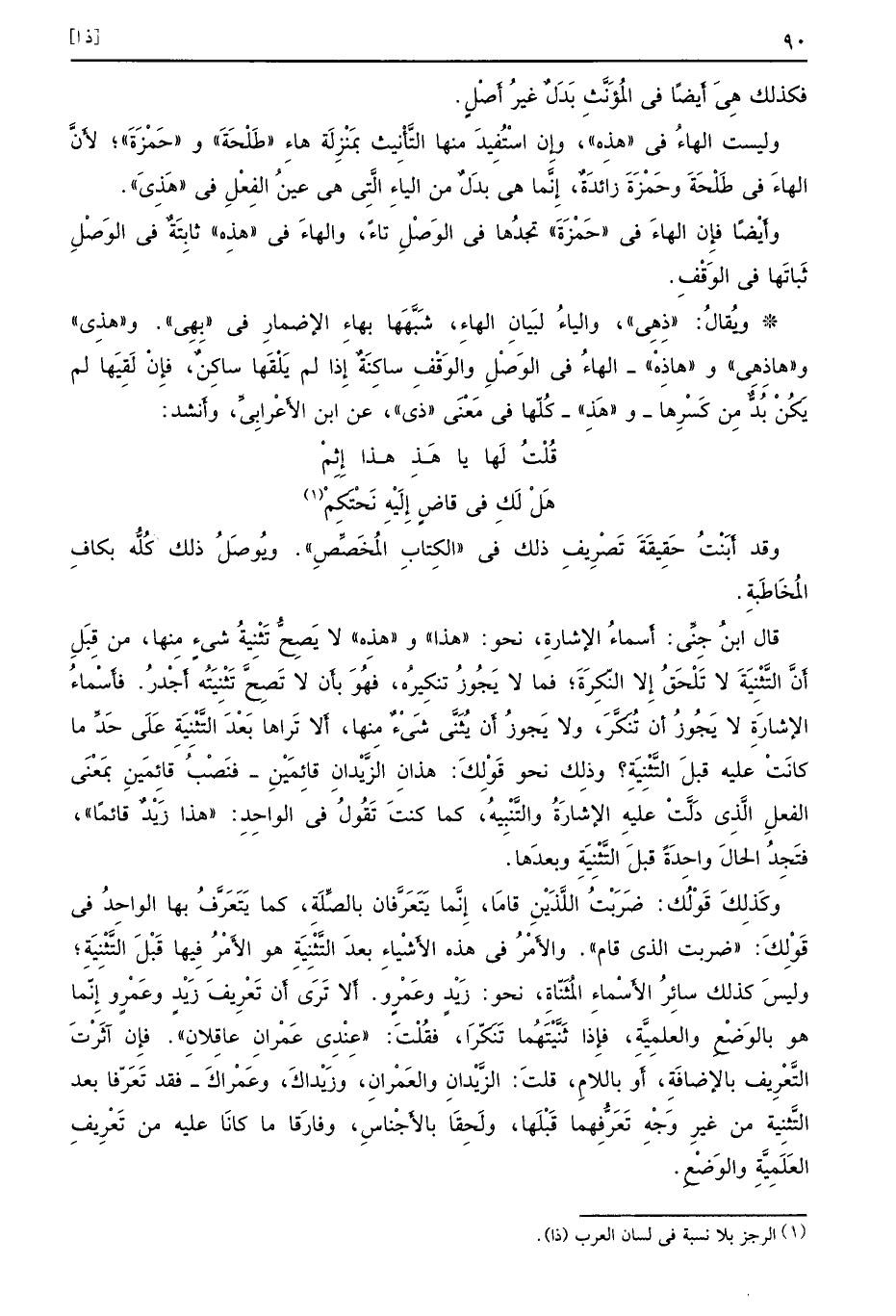 وقد أَبَنْتُ حَقِيقَةَ تَصْرِيفِ ذلك في الكِتابِ المُخَصِّصِ ويُوصَلُ ذلك كُلُّه بكافِ المُخَاطَبةِ قال ابنُ جِنِّي أَسماءُ الإشارةِ نحو هذا وهذِه لا يَصِحُّ تَثْنِيةُ شيءٍ مِنها من قِبَلِ أَنَّ التَّثْنِيَةَ لا تَلْحَقُ إِلا النّكِرَةَ فما لا يَجُوزُ تنكِيرُه فهُوَ بأَن لا تَصِحَّ تَثْنِيَتُه أَجْدرُ فأَسْماءُ الإشارَةِ لا يَجُوزُ أن تُنَكَّرَ ولا يَجوزُ أَن يُثَنَّى شَيْءٌ مِنها أَلا تَراها بَعْدَ التَّثْنِيَةِ عَلَى حَدٍّ ما كانَتْ عليه قبلَ التَّثْنِيَةِ وذلِك نحو قَوْلِكَ هذانِ الزَّيْدانِ قائِمَيْنِ فنَصْبُ قائِمَينِ بمَعْنَى الفعلِ الَّذِي دَلَّتْ عليهِ الإشارَةُ والتَّنْبِيهُ كما كنتَ تَقُولُ في الواحِدِ هذا زَيْدٌ قائمًا فتَجِدُ الحالَ واحِدَةً قبلَ التَّثْنِيَةِ وبعدَها وكَذلِكَ قَوْلُك ضَرَبْتُ اللَّذَيْنِ قامَا إِنَّما يَتَعَرَّفان بالصِّلَةِ كما يَتَعَرَّفُ بها الواحِدُ في قَوْلِكَ ضربت الذي قام والأَمْرُ في هذه الأَشْياءِ بعدَ التَّثْنِيَةِ هو الأَمْرُ فِيها قَبْلَ التَّثْنِيَةِ وليسَ كذلك سائِرُ الأَسْماءِ المُثَنّاةِ نحو زَيْدٍ وعَمْرٍ وأَلا تَرَى أَن تَعْرِيفَ زَيْدٍ وعَمْرٍ وإِنّما هو بالوَضْعِ والعلمِيَّةِ فإِذا ثَنَّيْتَهُما تَنَكّرَا فقُلْتَ عِنْدِي عَمْرانِ عاقِلانِ فإِن آثَرْتَ التَّعْرِيف بالإضافَةِ أَو باللامِ قلتَ الزَّيْدانِ والعَمْرانِ وزَيْداكَ وعَمْراكَ فقد تَعَرّفا بعد التَّثنِية من غيرِ وَجْهِ تَعَرُّفِهما قَبْلَها ولَحِقَا بالأَجْناسِ وفارَقا ما كانَا عليه من تَعْرِيفِ العَلَمِيَّةِ والوَضْعِ