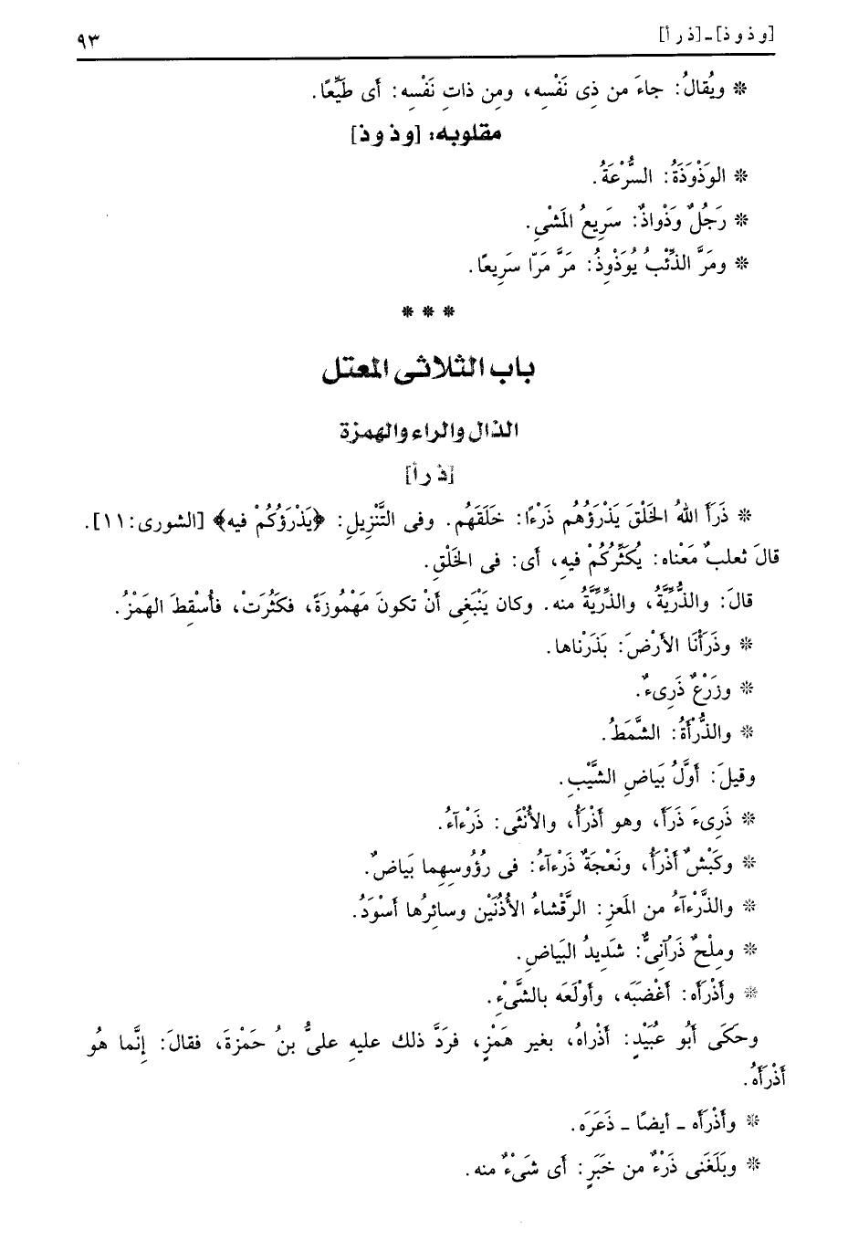 [ذرأ] ذَرَأَ اللهُ الخَلْقَ يَذْرَؤُهُم ذَرْءًا خَلَقَهُم وفي التَّنْزِيلِ {يذرؤكم فيه} الشورى 11 قالَ ثعلبٌ مَعْناه يُكَثِّرُكُمْ فيهِ أَي في الخَلْقِ قالَ والذُّرِّيَّةُ والذِّرِّيَّةُ منه وكان يَنْبَغِيَ أَنْ تكونَ مَهْمُوزَةً فكَثُرَتْ فأُسْقِطَ الهَمْزُ وذَرَأْنَا الأَرْضَ بَذَرْناها وزَرْعٌ ذَرِىءٌ والذُّرْأَةُ الشَّمْطُ وقيلَ أَوَّلُ بَياضِ الشَّيْبِ ذَرِىءَ ذَرَأَ وهو أَذْرَأْ والأُنْثَى ذَرْءآءُ وكَبْشٌ أَذْرَأُ ونَعْجَةٌ ذَرْءآءُ في رُؤوسِهِما بَياضٌ والذَّرْءآءُ من المَعزِ الرَّقْشاءُ الأُذُنَيْن وسائِرُها أَسْوَدُ ومِلْحٌ ذَرْآنِيٌّ شَدِيدُ البَياضِ وأَذْرَأَه أَغْضَبَه وأَوْلَعَه بالشَّيْءِ وحَكَى أَبُو عُبَيْدٍ أَذْراهُ بغير هَمْزٍ فرَدَّ ذلك عليهِ عليُّ بنُ حَمْزةَ فقالَ إِنَّما هُو أَذْرَأَهُ وأَذْرَأَه أيضًا ذَعَرَه وبَلَغَني ذَرْءٌ من خَبَرٍ أَي شَيْءٌ منه