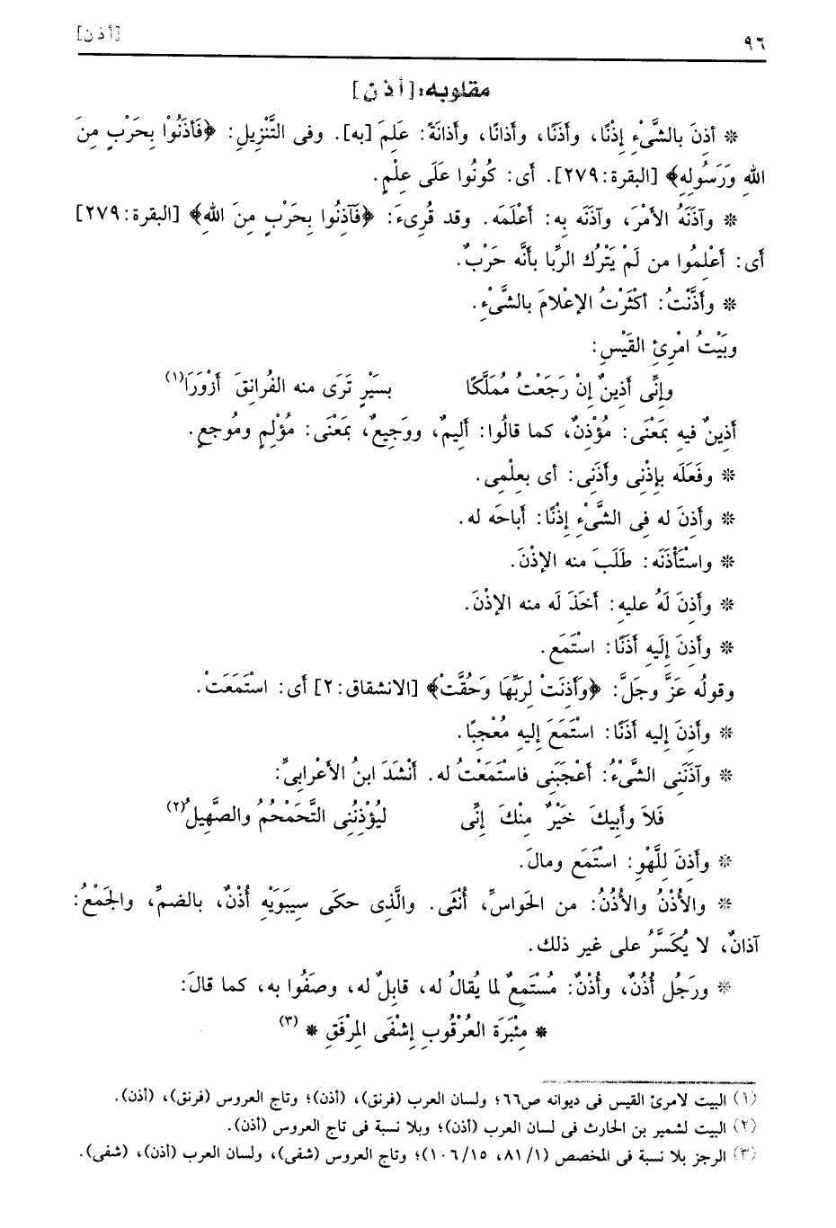 [أذ ن] أذِنَ بالشَّيْءِ إِذْنًا وأَذَنًا وأَذانًا وأَذانَةً عَلِمَ به وفي التَّنْزِيلِ {فأذنوا بحرب من الله ورسوله} البقرة 279 أَي كُونُوا عَلَى عِلْمٍ وآذَنَهُ الأَمْرُ وآذَنَه بِه أَعْلَمَه وقد قُرِئَ {فأذنوا بحرب من الله} البقرة 279 أَي أَعْلِمُوا من لَمْ يَتْرُك الرِّبا بأَنَّه حَرْبٌ وأَذَّنْتُ أكْثَرْتُ الإعْلامَ بالشَّيْءِ وبَيْتُ امْرِئِ القَيْسِ