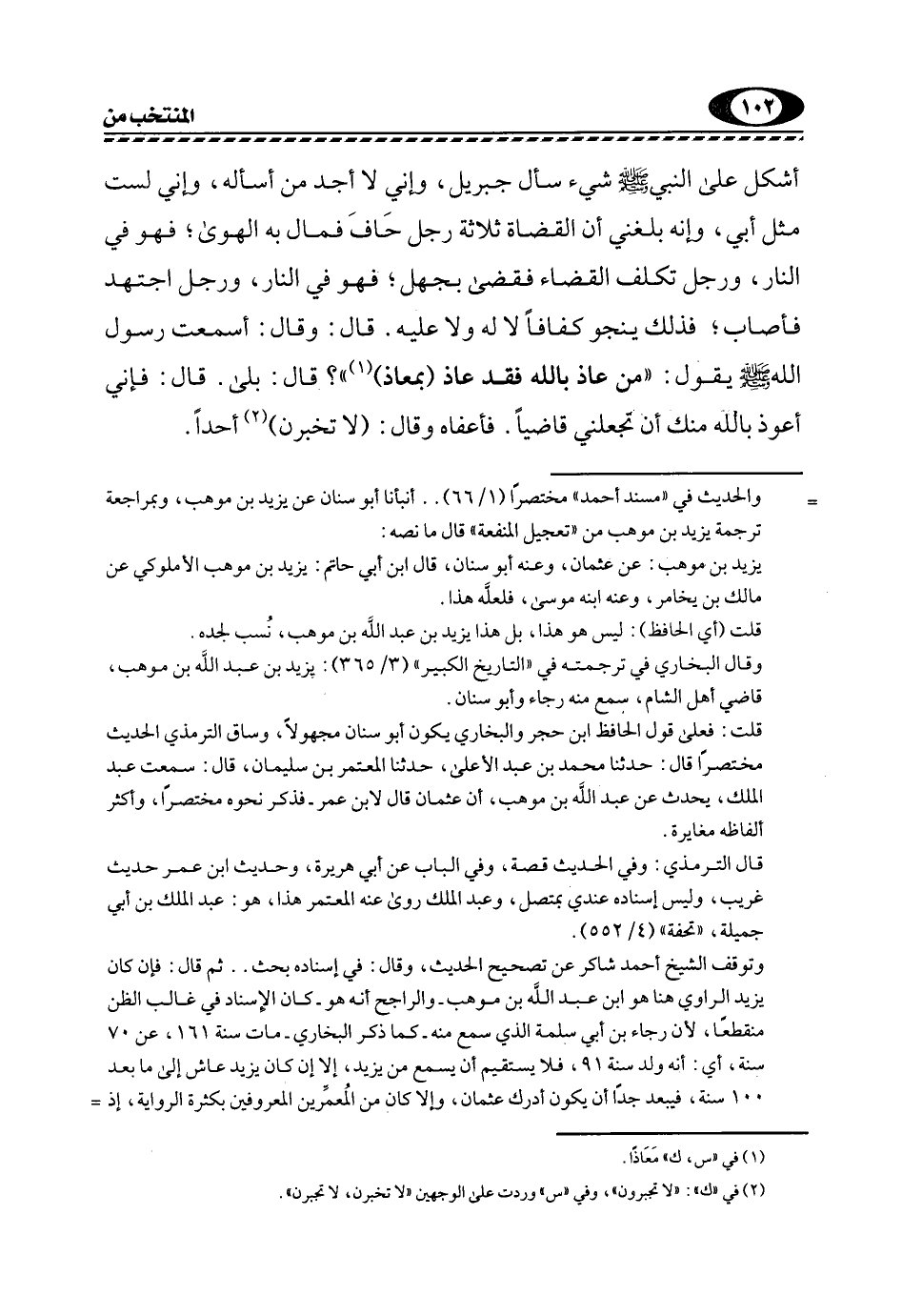 أَشْكَلَ عَلَى النَّبِيِّ -صَلَّى اللهُ عَلَيْهِ وَسَلَّمَ- شَيْءٌ سَأَلَ جِبْرِيلَ، وَإِنِّي لَا أَجِدُ مَنْ أَسْأَلُهُ، وَإِنِّي لَسْتُ مِثْلَ أَبِي، وَإِنَّهُ بَلَغَنِي أَنَّ الْقُضَاةَ ثَلَاثَةٌ: رَجُلٌ حاف فَمَالَ بِهِ الْهَوَى؛ فَهُوَ فِي النَّارِ، وَرَجُلٌ تَكَلَّفَ الْقَضَاءَ فَقَضَى بِجَهْلٍ، فَهُوَ فِي النَّارِ، وَرَجُلٌ اجْتَهَدَ فَأَصَابَ؛ فَذَلِكَ يَنْجُو كَفَافًا, لَا لَهُ وَلَا عَلَيْهِ. قَالَ: وَقَالَ: أَسَمِعْتَ رَسُولَ اللَّهِ -صَلَّى اللهُ عَلَيْهِ وَسَلَّمَ- يَقُولُ: "مَنِ عَاذَ بِاللَّهِ, فَقَدْ عَاذَ "بِمَعَاذٍ"1"؟ قَالَ: بَلَى. قَالَ: فَإِنِّي أَعُوذُ بِاللَّهِ مِنْكَ أَنْ تَجْعَلَنِي قَاضِيًا. فَأَعْفَاهُ وَقَالَ: "لَا تُخْبِرَنَّ"2 أَحَدًا.