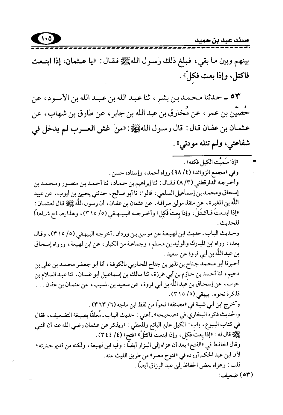 53- حَدَّثَنَا مُحَمَّدُ بْنُ بِشْرٍ، ثَنَا عَبْدُ اللَّهِ بْنُ عَبْدِ اللَّهِ بْنِ الْأَسْوَدِ، عَنْ حُصَيْنِ بْنِ عُمَرَ، عَنْ مُخَارِقِ بْنِ عَبْدِ اللَّهِ بْنِ جَابِرٍ، عَنْ طَارِقِ بْنِ شِهَابٍ، عَنْ عُثْمَانَ بْنِ عَفَّانَ قَالَ: قَالَ رَسُولُ اللَّهِ, صَلَّى اللهُ عَلَيْهِ وَسَلَّمَ: "مَنْ غَشَّ الْعَرَبَ لَمْ يَدْخُلْ فِي شَفَاعَتِي، وَلَمْ تَنَلْهُ مَوَدَّتِي".