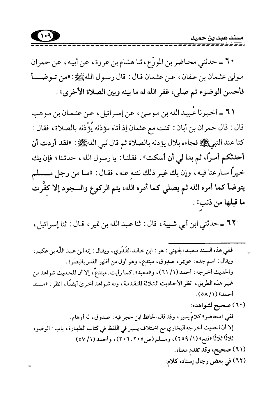 60- حَدَّثَنِي مُحَاضِرُ بْنُ الْمُوَرِّعِ، ثَنَا هِشَامِ بْنِ عُرْوَةَ، عَنْ أَبِيهِ، عَنْ حُمْرَانَ مَوْلَى عُثْمَانَ بْنِ عَفَّانَ، عَنْ عُثْمَانَ قَالَ: قَالَ رَسُولَ اللَّهِ, صَلَّى اللهُ عَلَيْهِ وَسَلَّمَ: "مَنْ تَوَضَّأَ فَأَحْسَنَ الْوُضُوءَ ثم صلى؛ غفر الله مَا بَيْنَهُ وَبَيْنَ الصَّلَاةِ الْأُخْرَى".