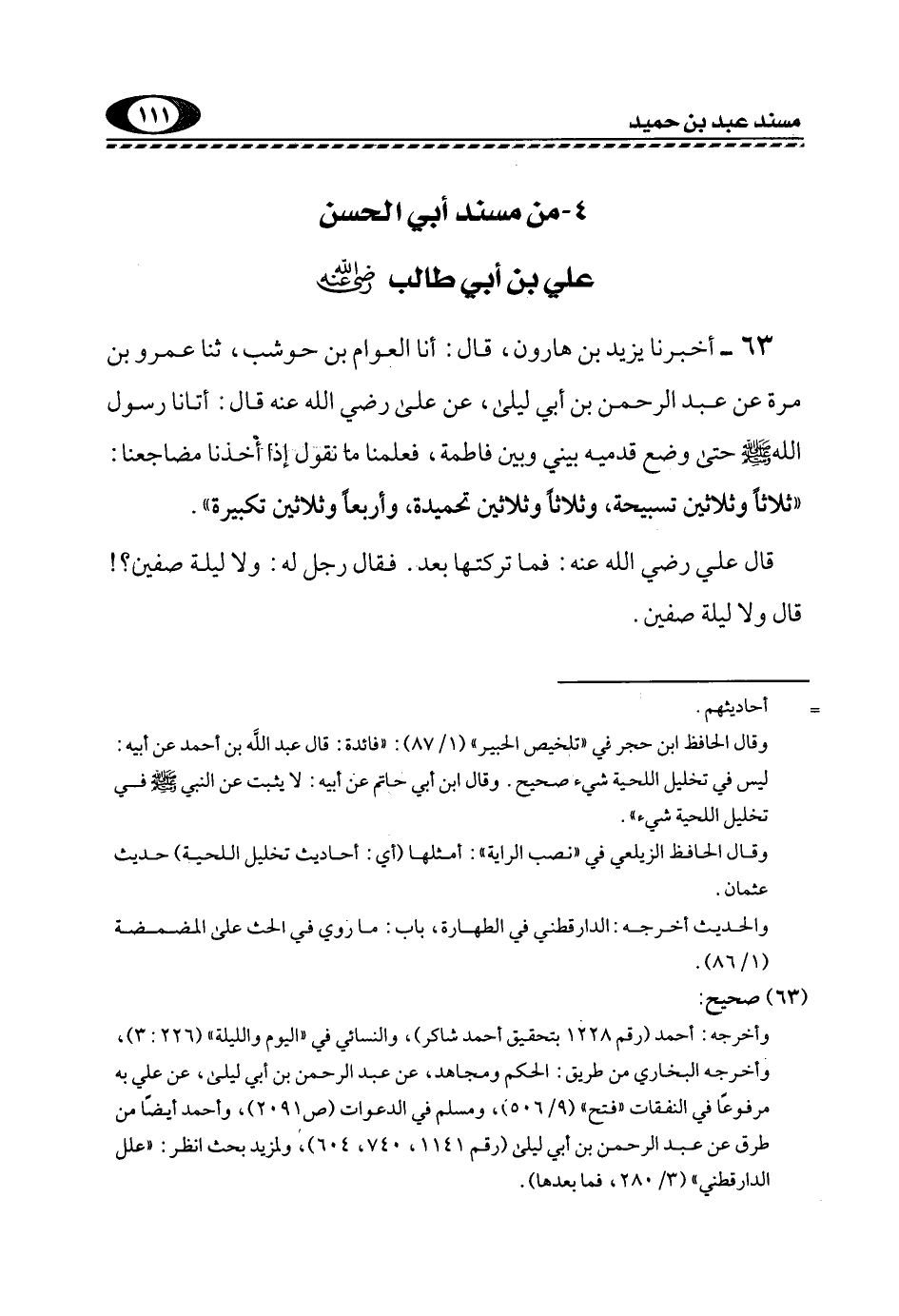 63- أَخْبَرَنَا يَزِيدُ بْنُ هَارُونَ، قَالَ: أنا الْعَوَّامُ بْنُ حَوْشَبٍ، ثَنَا عَمْرُو بْنُ مُرَّةَ عَنْ عَبْدِ الرَّحْمَنِ بْنِ أَبِي لَيْلَى، عَنْ عَلِيٍّ -رَضِيَ اللَّهُ عَنْهُ- قَالَ: أَتَانَا رَسُولُ اللَّهِ -صَلَّى اللهُ عَلَيْهِ وَسَلَّمَ- حَتَّى وَضَعَ قَدَمَيْهِ بَيْنِي وَبَيْنَ فَاطِمَةَ، فَعَلَّمَنَا مَا نَقُولُ إِذَا أَخَذْنَا مَضَاجِعَنَا: "ثَلَاثًا وَثَلَاثِينَ تَسْبِيحَةً، وَثَلَاثًا وَثَلَاثِينَ تَحْمِيدَةً، وَأَرْبَعًا وَثَلَاثِينَ تَكْبِيرَةً".