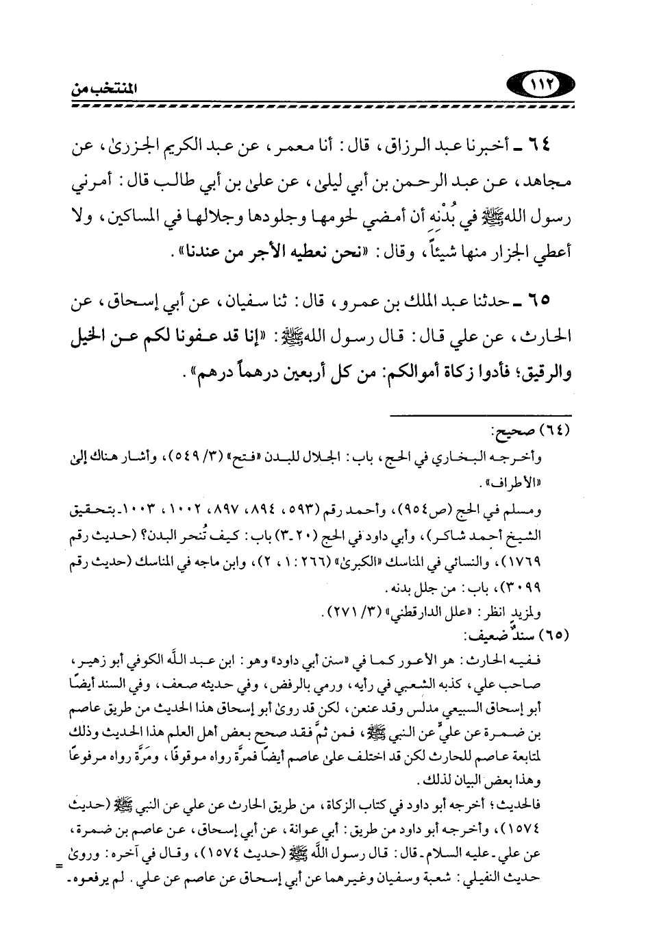 64- أَخْبَرَنَا عَبْدُ الرَّزَّاقِ، قَالَ: أنا مَعْمَرٌ، عَنْ عَبْدِ الْكَرِيمِ الْجَزَرِيِّ، عَنْ مُجَاهِدٍ، عَنْ عَبْدِ الرَّحْمَنِ بْنِ أَبِي لَيْلَى، عَنْ عَلِيٍّ بْنِ أَبِي طَالِبٍ قَالَ: أَمَرَنِي رَسُولَ اللَّهِ -صَلَّى اللهُ عَلَيْهِ وَسَلَّمَ- فِي بُدْنه أَنْ أُمْضِيَ لُحُومَهَا وَجُلُودَهَا وَجِلَالَهَا فِي الْمَسَاكِينِ، وَلَا أُعْطِيَ الْجَزَّارَ مِنْهَا شَيْئًا، وَقَالَ: "نَحْنُ نُعْطِيهِ الْأَجْرَ مِنْ عِنْدِنَا".