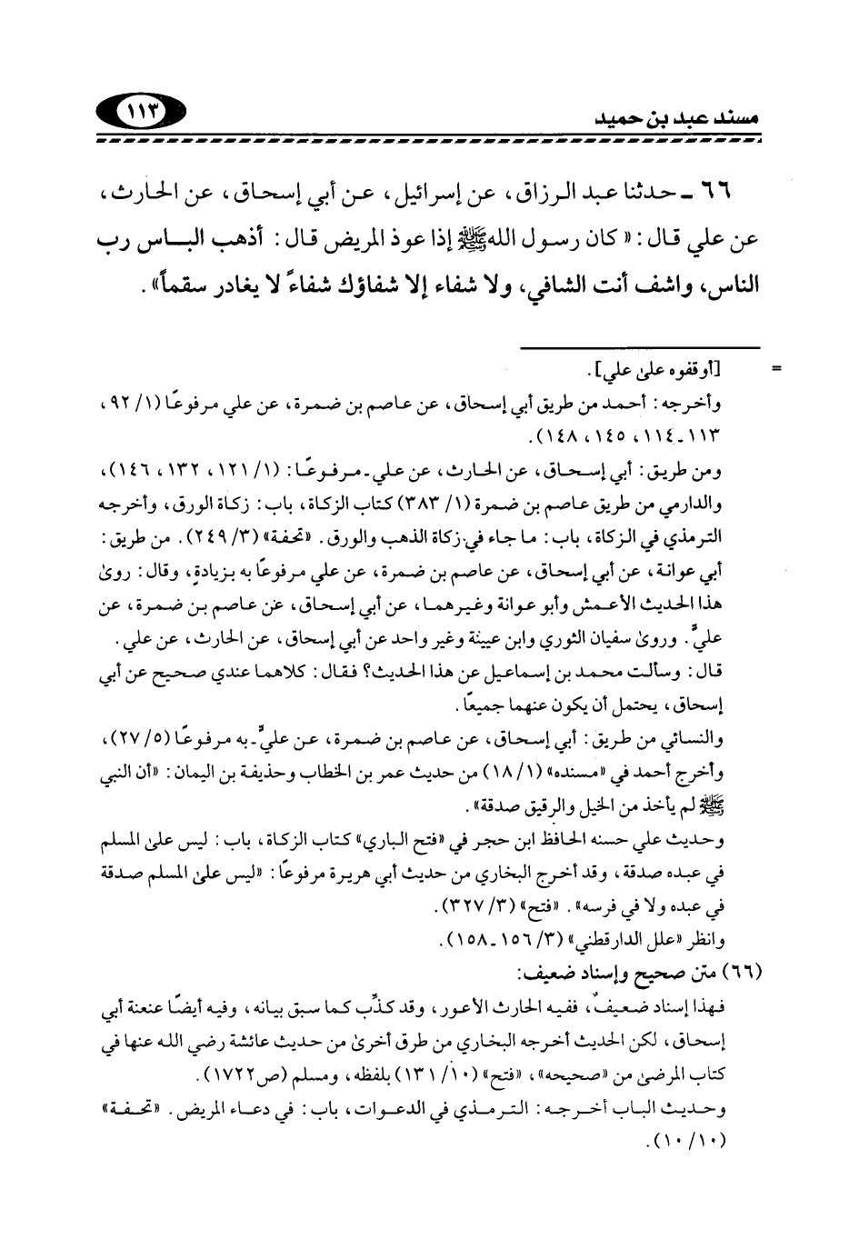 66- حَدَّثَنَا عَبْدُ الرَّزَّاقِ، عَنْ إِسْرَائِيلَ، عَنْ أَبِي إِسْحَاقَ، عَنِ الْحَارِثِ، عَنْ عَلِيٍّ قَالَ: "كَانَ رَسُولُ اللَّهِ -صَلَّى اللهُ عَلَيْهِ وَسَلَّمَ- إِذَا عَوَّذَ الْمَرِيضَ قَالَ: "أَذْهِبِ الْبَأْسَ رَبَّ النَّاسِ، وَاشْفِ أَنْتَ الشَّافِي، وَلَا شِفَاءَ إِلَّا شِفَاؤُكَ, شفاء لا يغادر سقما" ".