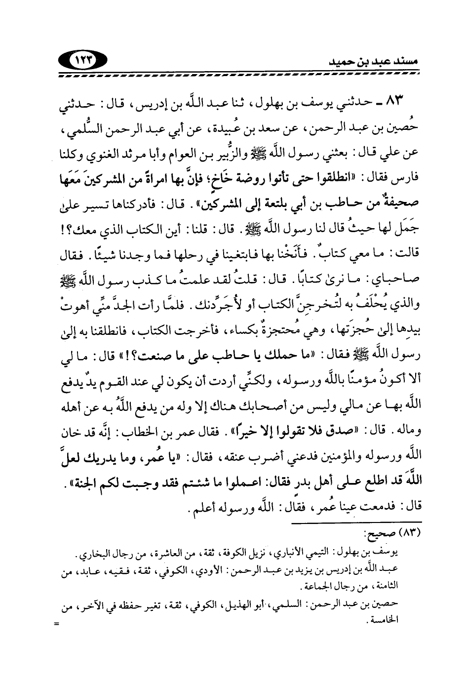 83- حَدَّثَنِي يُوسُفُ بْنُ بُهْلُولٍ، ثَنَا عَبْدُ اللَّهِ بْنُ إِدْرِيسَ، قَالَ: حَدَّثَنِي حُصَيْنُ بْنُ عَبْدِ الرَّحْمَنِ، عَنْ سَعْدِ بْنِ عُبَيْدَةَ، عَنْ أَبِي عَبْدِ الرَّحْمَنِ السُّلَمِيِّ، عَنْ عَلِيٍّ قَالَ: بَعَثَنِي رَسُولُ اللَّهِ -صَلَّى اللهُ عَلَيْهِ وَسَلَّمَ- وَالزُّبَيْرَ بْنَ الْعَوَّامِ وَأَبَا مَرْثَدٍ الْغَنَوِيَّ وَكُلُّنَا فَارِسٌ فَقَالَ: "انْطَلِقُوا حَتَّى تَأْتُوا رَوْضَةَ خَاخٍ؛ فَإِنَّ بِهَا امْرَأَةً مِنَ الْمُشْرِكِينَ, مَعَهَا صَحِيفَةٌ مِنْ حَاطِبِ بْنِ أَبِي بَلْتَعَةَ إِلَى الْمُشْرِكِينَ". قَالَ: فَأَدْرَكْنَاهَا تَسِيرُ عَلَى جَمَلٍ لَهَا حَيْثُ قَالَ لَنَا رَسُولُ اللَّهِ صَلَّى اللهُ عَلَيْهِ وَسَلَّمَ. قَالَ: قُلْنَا: أَيْنَ الْكِتَابُ الَّذِي مَعَكِ؟! قَالَتْ: مَا مَعِيَ كِتَابٌ. فَأَنَخْنَا بِهَا فَابْتَغَيْنَا فِي رَحْلِهَا فَمَا وَجَدْنَا شَيْئًا. فَقَالَ صَاحِبَايَ: مَا نَرَى كِتَابًا. قَالَ: قُلْتُ: لَقَد عَلِمْتُ مَا كَذَبَ رَسُولُ اللَّهِ -صَلَّى اللهُ عَلَيْهِ وَسَلَّمَ- وَالَّذِي يُحلَف بِهِ لَتُخْرِجِنَّ الْكِتَابَ أَوْ لَأُجَرِّدَنَّكِ. فَلَمَّا رَأَتِ الْجِدَّ مِنِّي أَهْوَتْ بِيَدِهَا إِلَى حُجُزَتِهَا، وَهِيَ مُحْتَجِزَةٌ بِكِسَاءٍ، فَأَخْرَجَتِ الْكِتَابَ، فَانْطَلَقْنَا بِهِ إِلَى رَسُولَ اللَّهِ -صَلَّى اللهُ عَلَيْهِ وَسَلَّمَ- فَقَالَ: "مَا حَمَلَكَ يَا حَاطِبُ عَلَى مَا صَنَعْتَ؟! " قَالَ: مَا لِي أَلَّا أَكُونَ مُؤْمِنًا بِاللَّهِ وَرَسُولِهِ، وَلَكِنِّي أَرَدْتُ أَنْ يَكُونَ لِي عِنْدَ الْقَوْمِ يَدٌ يَدْفَعُ اللَّهُ بِهَا عَنْ مَالِي, وَلَيْسَ مِنْ أَصْحَابِكَ هُنَاكَ إِلَّا وَلَهُ مَنْ يَدْفَعُ اللَّهُ بِهِ عَنْ أَهْلِهِ وَمَالِهِ. قَالَ: "صَدَقَ فلا تقولوا إِلَّا خَيْرًا". فَقَالَ عُمَرُ بْنُ الْخَطَّابِ: إِنَّهُ قَدْ خَانَ اللَّهَ وَرَسُولَهُ وَالْمُؤْمِنِينَ, فَدَعْنِي أَضْرِبْ عُنُقَهُ، فَقَالَ: "يَا عُمَرُ، وَمَا يُدْرِيكَ لَعَلَّ اللَّهَ قَدِ اطَّلَعَ عَلَى أَهْلِ بَدْرٍ فَقَالَ: اعْمَلُوا مَا شِئْتُمْ, فَقَدْ وَجَبَتْ لَكُمُ الْجَنَّةُ". قَالَ: فَدَمَعَتْ عَيْنَا عُمَرَ، فَقَالَ: والله ورسوله أعلم.