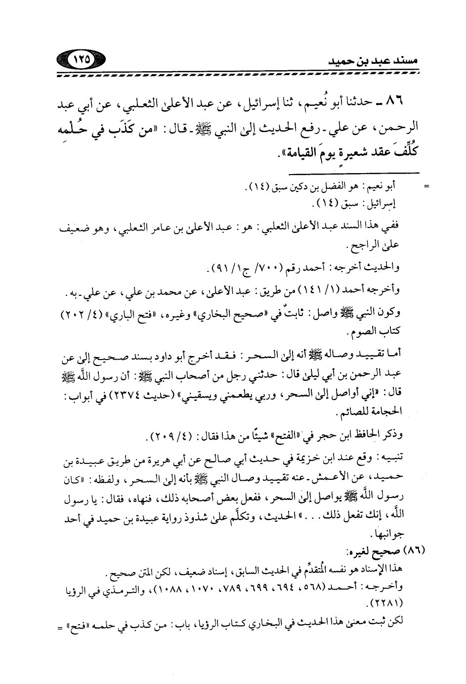 86- حَدَّثَنَا أَبُو نُعَيْمٍ، ثَنَا إِسْرَائِيلُ، عَنْ عَبْدِ الْأَعْلَى الثَّعْلَبِيِّ، عَنْ أَبِي عَبْدِ الرَّحْمَنِ، عَنْ عَلِيٍّ -رَفَعَ الْحَدِيثَ إِلَى النَّبِيِّ صَلَّى اللهُ عَلَيْهِ وَسَلَّمَ- قَالَ: "مَنْ كَذَبَ فِي حُلْمِهِ, كُلِّفَ عَقْدَ شعيرة يوم القيامة".