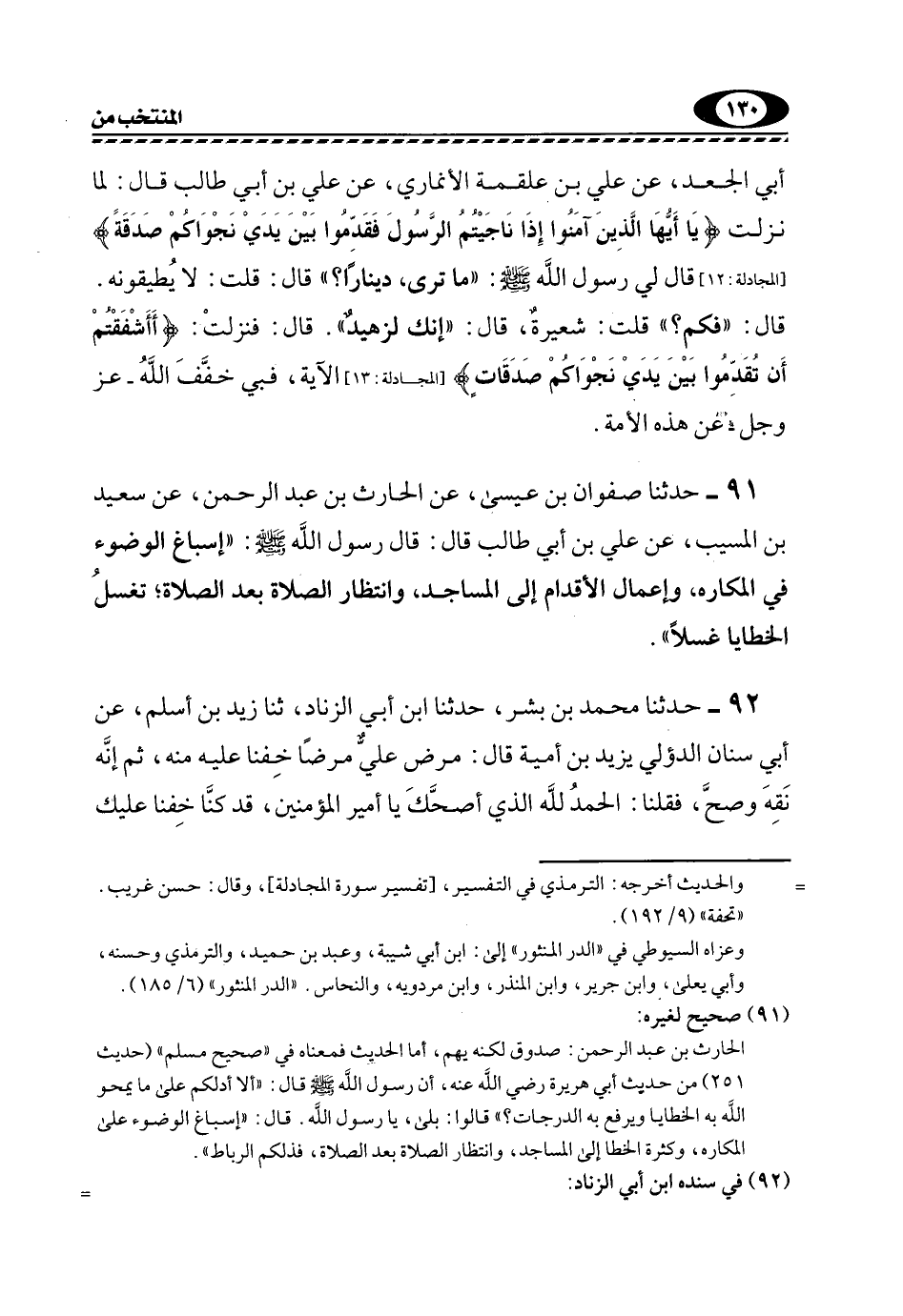 91- حَدَّثَنَا صَفْوَانُ بْنُ عِيسَى، عَنِ الْحَارِثِ بْنِ عَبْدِ الرَّحْمَنِ، عَنْ سَعِيدِ بْنِ الْمُسَيِّبِ، عَنْ عَلِيِّ بْنِ أَبِي طَالِبٍ قَالَ: قَالَ رَسُولُ اللَّهِ, صَلَّى اللهُ عَلَيْهِ وَسَلَّمَ: "إِسْبَاغُ الْوُضُوءِ فِي الْمَكَارِهِ، وَإِعْمَالُ الْأَقْدَامِ إِلَى الْمَسَاجِدِ، وَانْتِظَارُ الصَّلَاةِ بَعْدَ الصَّلَاةِ؛ تَغْسِلُ الْخَطَايَا غَسْلًا".