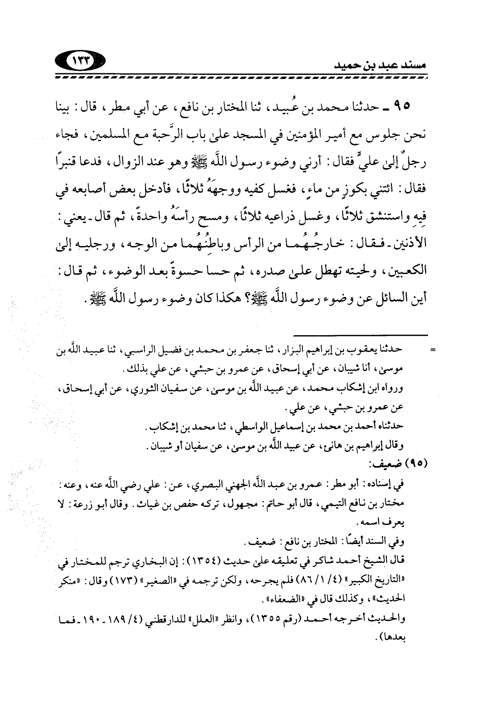 95- حَدَّثَنَا مُحَمَّدُ بْنُ عُبَيْدٍ، ثَنَا الْمُخْتَارُ بْنُ نَافِعٍ، عَنْ أَبِي مَطَرٍ، قَالَ: بَيْنَا نَحْنُ جُلُوسٌ مَعَ أَمِيرِ الْمُؤْمِنِينَ فِي الْمَسْجِدِ عَلَى بَابِ الرَّحَبَةِ مَعَ الْمُسْلِمِينَ، فَجَاءَ رَجُلٌ إِلَى عَلِيٍّ فَقَالَ: أَرِنِي وُضُوءَ رَسُولِ اللَّهِ -صَلَّى اللهُ عَلَيْهِ وَسَلَّمَ- وَهُوَ عِنْدَ الزَّوَالِ، فَدَعَا قَنْبَرًا فَقَالَ: ائْتِنِي بِكُوزٍ مَنْ مَاءٍ، فَغَسَلَ كَفَّيْهِ وَوَجْهَهُ ثَلَاثًا، فَأَدْخَلَ بَعْضَ أَصَابِعِهِ فِي فِيهِ وَاسْتَنْشَقَ ثَلَاثًا، وَغَسَلَ ذِرَاعَيْهِ ثَلَاثًا، وَمَسَحَ رَأْسَهُ وَاحِدَةً، ثُمَّ قَالَ -يَعْنِي: الْأُذُنَيْنِ- فَقَالَ: خَارِجُهُمَا مِنَ الرَّأْسِ وَبَاطِنُهُمَا مِنَ الْوَجْهِ، وَرِجْلَيْهِ إِلَى الْكَعْبَيْنِ، وَلِحْيَتُهُ تَهْطِلُ عَلَى صَدْرِهِ، ثُمَّ حَسَا حَسْوَةً بَعْدَ الْوُضُوءِ، ثُمَّ قَالَ: أَيْنَ السَّائِلُ عَنْ وُضُوءِ رَسُولِ اللَّهِ, صَلَّى اللهُ عَلَيْهِ وَسَلَّمَ؟ هَكَذَا كَانَ وُضُوءُ رَسُولِ اللَّهِ, صَلَّى اللهُ عَلَيْهِ وَسَلَّمَ.