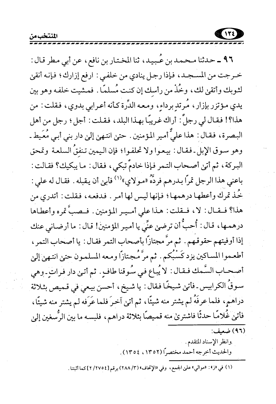 96- حَدَّثَنَا مُحَمَّدُ بْنُ عُبَيْدٍ، ثَنَا الْمُخْتَارُ بْنُ نَافِعٍ، عَنْ أَبِي مَطَرٍ قَالَ: خَرَجْتُ مِنَ الْمَسْجِدِ، فَإِذَا رَجُلٌ يُنَادِي مَنْ خَلْفِي: ارْفَعْ إِزَارَكَ؛ فَإِنَّهُ أَنْقَى لِثَوْبِكَ وَأَتْقَى لَكَ، وَخُذْ مِنْ رَأْسِكَ إِنْ كُنْتَ مُسْلِمًا. فَمَشِيتُ خَلْفَهُ وَهُوَ بَيْنَ يَدَيَّ مُؤْتَزِرٌ بِإِزَارٍ، مرتدٍ بِرِدَاءٍ، وَمَعَهُ الدِّرَّةُ كَأَنَّهُ أَعْرَابِيٌّ بَدَوِيٌّ، فَقُلْتُ: مَنْ هَذَا؟! فَقَالَ لِي رَجُلٌ: أَرَاكَ غَرِيبًا بِهَذَا الْبَلَدِ، فَقُلْتُ: أَجَلْ؛ رَجُلٌ مِنْ أَهْلِ الْبَصْرَةِ، فَقَالَ: هَذَا عَلِيٌّ أَمِيرُ الْمُؤْمِنِينَ, حَتَّى انْتَهَى إِلَى دَارِ بَنِي أَبِي مُعَيْطٍ -وَهُوَ سُوقُ الْإِبِلِ- فَقَالَ: بِيعُوا وَلَا تَحْلِفُوا؛ فَإِنَّ الْيَمِينَ تُنْفِقُ السِّلْعَةَ وَتَمْحَقُ الْبَرَكَةَ، ثُمَّ أَتَى أَصْحَابَ التَّمْرِ فَإِذَا خَادِمٌ تَبْكِي، فَقَالَ: مَا يبكيكِ؟ فَقَالَتْ: بَاعَنِي هَذَا الرَّجُلُ تَمْرًا بِدِرْهَمٍ فَرَدَّهُ "مولاي"1 فَأَبَى أَنْ يَقْبَلَهُ. فَقَالَ لَهُ عَلِيٌّ: خُذْ تَمْرَكَ وَأَعْطِهَا دِرْهَمَهَا؛ فَإِنَّهَا لَيْسَ لَهَا أَمْرٌ. فَدَفَعَهُ، فَقُلْتُ: أَتَدْرِي مَنْ هَذَا؟ فَقَالَ: لَا، فَقُلْتُ: هَذَا عَلِيٌّ أَمِيرُ الْمُؤْمِنِينَ. فَصَبَّ تَمْرَهُ وَأَعْطَاهَا دِرْهَمَهَا، قَالَ: أُحِبُّ أَنْ تَرْضَى عَنِّي يَا أَمِيرَ الْمُؤْمِنِينَ! قَالَ: مَا أَرْضَانِي عَنْكَ إِذَا أَوْفَيْتَهُمْ حُقُوقَهُمْ. ثُمَّ مَرَّ مُجْتَازًا بِأَصْحَابِ التَّمْرِ فَقَالَ: يَا أَصْحَابَ التَّمْرِ، أَطْعِمُوا الْمَسَاكِينَ يَزِدْ كَسْبُكُمْ. ثُمَّ مَرَّ مُجْتَازًا وَمَعَهُ الْمُسْلِمُونَ حَتَّى انْتَهَى إِلَى أَصْحَابِ السَّمَكِ فَقَالَ: لَا يُبَاعُ فِي سُوقِنَا طافٍ. ثُمَّ أَتَى دَارَ فُرَاتٍ -وَهِيَ سُوقُ الْكَرَابِيسِ- فَأَتَى شَيْخًا فَقَالَ: يَا شَيْخُ، أَحْسِنْ بَيْعِي فِي قَمِيصٍ بِثَلَاثَةِ دَرَاهِمَ، فَلَمَّا عَرَفَهُ لَمْ يشتر منه شيئا، تم أَتَى آخَرَ فَلَمَّا عَرَفَهُ لَمْ يَشْتَرِ مِنْهُ شَيْئًا، فَأَتَى غُلَامًا حَدَثًا فَاشْتَرَى مِنْهُ قَمِيصًا بِثَلَاثَةِ دَرَاهِمَ، فَلَبِسَهُ مَا بَيْنَ الرُّسْغَيْنِ إلى
