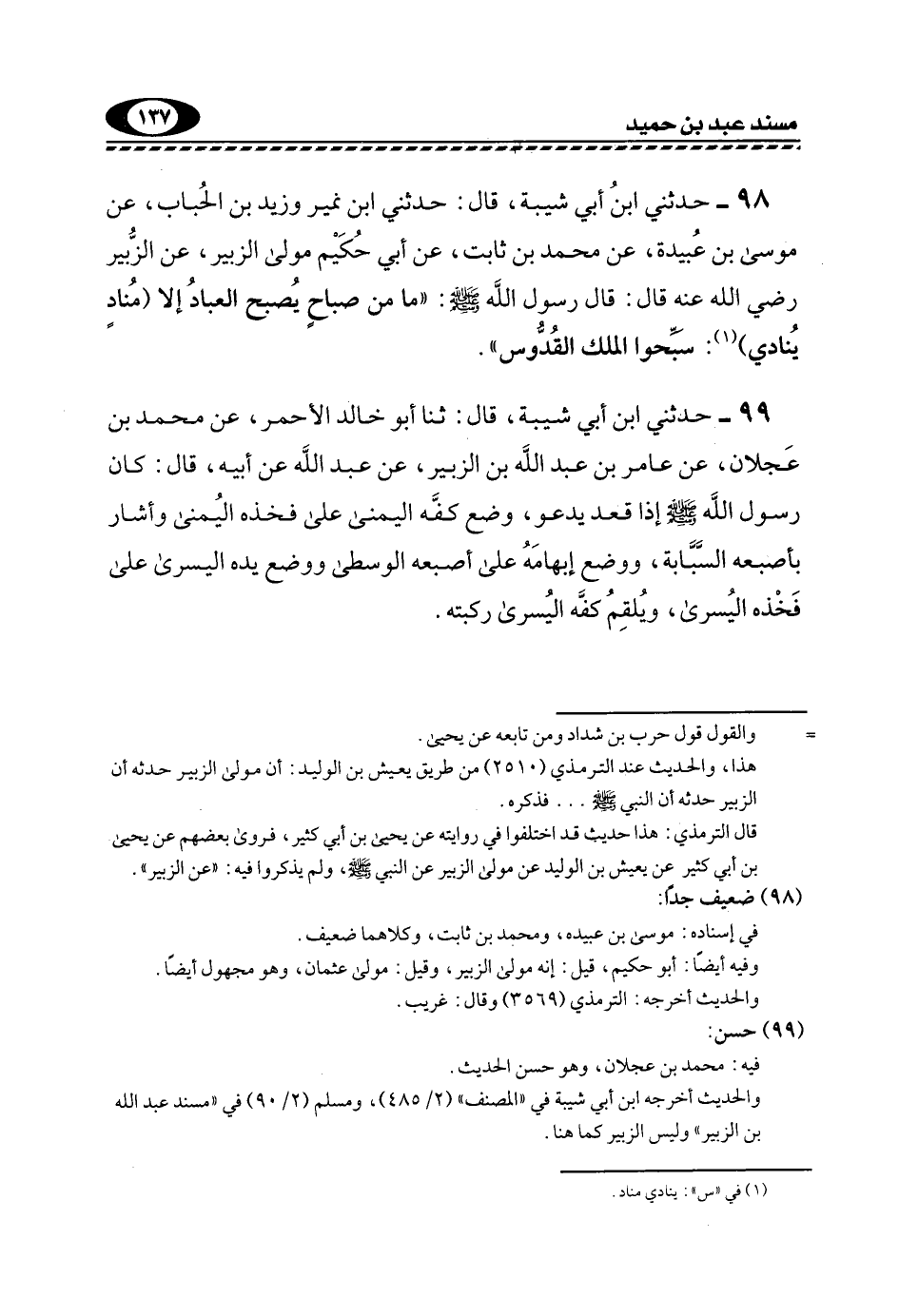 98- حَدَّثَنِي ابْنُ أَبِي شَيْبَةَ، قَالَ: حَدَّثَنِي ابْنُ نُمَيْرٍ وَزَيْدُ بْنُ الْحُبَابِ، عَنْ مُوسَى بْنِ عُبَيْدَةَ، عَنْ مُحَمَّدِ بْنِ ثَابِتٍ، عَنْ أَبِي حَكِيمٍ مَوْلَى الزُّبَيْرِ, عَنِ الزُّبَيْرِ رَضِيَ اللَّهُ عَنْهُ قَالَ: قَالَ رَسُولُ اللَّهِ صَلَّى اللهُ عَلَيْهِ وَسَلَّمَ: "مَا مِنْ صَبَاحٍ يُصْبِحُ الْعِبَادُ إِلَّا "منادٍ يُنَادِي"1: سَبِّحُوا الْمَلِكَ الْقُدُّوسَ".
