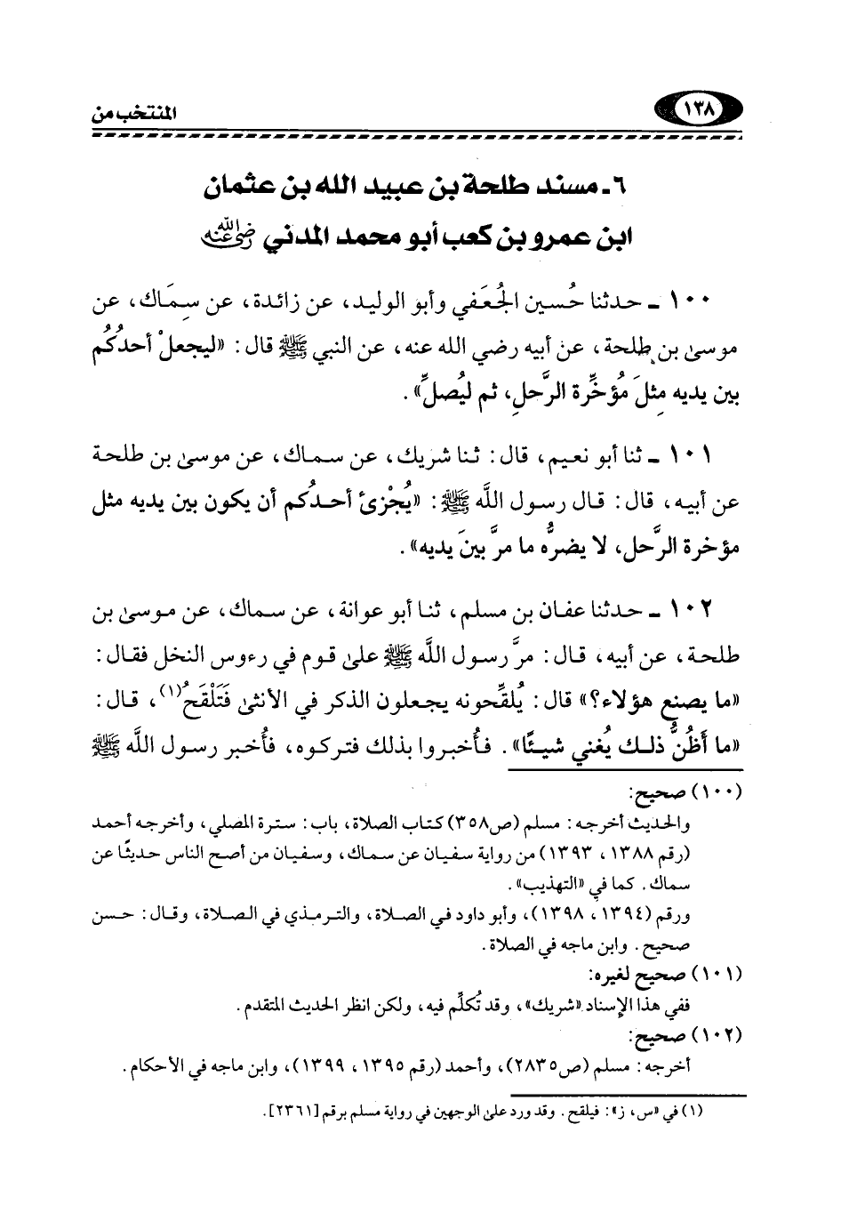 100- حَدَّثَنَا حُسَيْنٌ الْجُعْفِيُّ وَأَبُو الْوَلِيدِ، عَنْ زَائِدَةَ، عَنْ سِمَاكٍ، عَنْ مُوسَى بْنِ طَلْحَةَ، عَنْ أَبِيهِ رَضِيَ اللَّهُ عَنْهُ، عَنِ النَّبِيِّ -صَلَّى اللهُ عَلَيْهِ وَسَلَّمَ- قَالَ: "لِيَجْعَلْ أَحَدُكُمْ بَيْنَ يَدَيْهِ مِثْلَ مُؤَخِّرَةِ الرَّحْلِ، ثُمَّ لِيُصَلِّ".