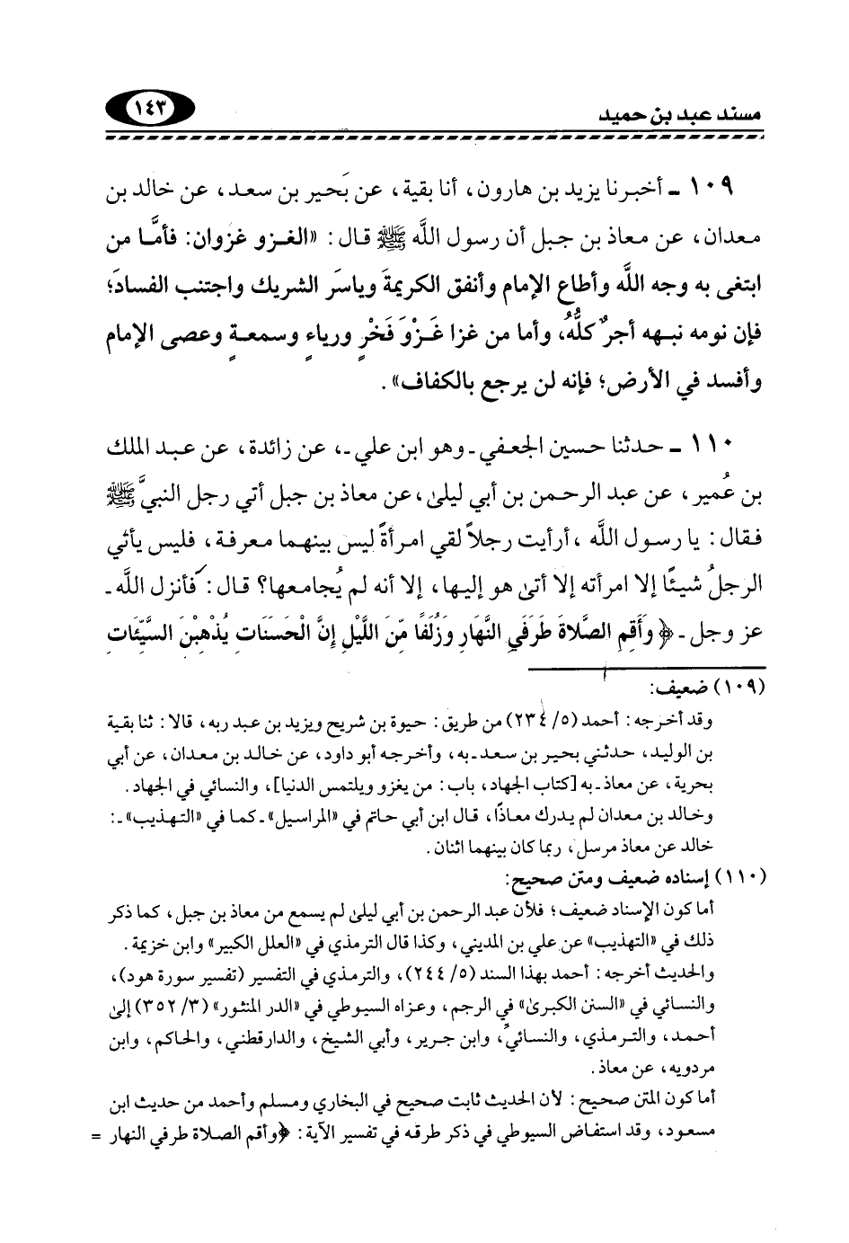 109- أَخْبَرَنَا يَزِيدُ بْنُ هَارُونَ، أنا بَقِيَّةُ، عَنْ بَحِيرِ بْنِ سَعْدٍ، عَنْ خَالِدِ بْنِ مَعْدَانَ، عَنْ مُعَاذِ بْنِ جَبَلٍ أَنَّ رَسُولَ اللَّهِ -صَلَّى اللهُ عَلَيْهِ وَسَلَّمَ- قَالَ: "الْغَزْوُ غَزْوَانِ: فَأَمَّا مَنِ ابْتَغَى بِهِ وَجْهَ اللَّهِ وَأَطَاعَ الْإِمَامَ وَأَنْفَقَ الْكَرِيمَةَ وَيَاسَرَ الشَّرِيكَ وَاجْتَنَبَ الْفَسَادَ؛ فَإِنَّ نَوْمَهُ وَنَبْهَهُ أَجْرٌ كُلُّهُ، وَأَمَّا مَنْ غَزَا غَزْوَ فَخْرٍ وَرِيَاءٍ وَسُمْعَةٍ وَعَصَى الْإِمَامَ وَأَفْسَدَ فِي الْأَرْضِ؛ فَإِنَّهُ لَنْ يَرْجِعَ بِالْكَفَافِ".