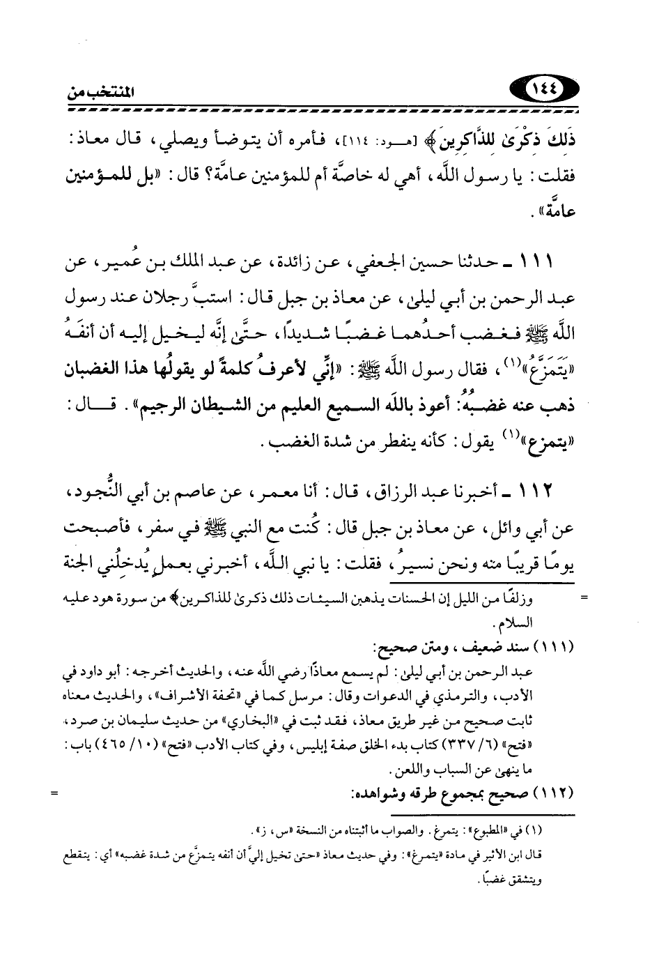 111- حَدَّثَنَا حُسَيْنٌ الْجُعْفِيُّ، عَنْ زَائِدَةَ، عَنْ عَبْدِ الْمَلِكِ بْنِ عُمَيْرٍ، عَنْ عَبْدِ الرَّحْمَنِ بْنِ أَبِي لَيْلَى، عَنْ مُعَاذِ بْنِ جَبَلٍ قَالَ: اسْتَبَّ رَجُلَانِ عِنْدَ رَسُولِ اللَّهِ -صَلَّى اللهُ عَلَيْهِ وَسَلَّمَ- فَغَضِبَ أَحَدُهُمَا غَضَبًا شَدِيدًا، حَتَّى إِنَّهُ ليخيل إليه أن أنفه "يتمزع"1، فَقَالَ رَسُولُ اللَّهِ صَلَّى اللهُ عليه وسلم: "إني أعرف كَلِمَةً لَوْ يَقُولُهَا هَذَا الْغَضْبَانُ ذَهَبَ عَنْهُ غَضَبُهُ: أَعُوذُ بِاللَّهِ السَّمِيعِ الْعَلِيمِ مِنَ الشَّيْطَانِ الرَّجِيمِ". قال: "يتمزع"1 يَقُولُ: كَأَنَّهُ يَنْفَطِرُ مِنْ شِدَّةِ الْغَضَبِ.