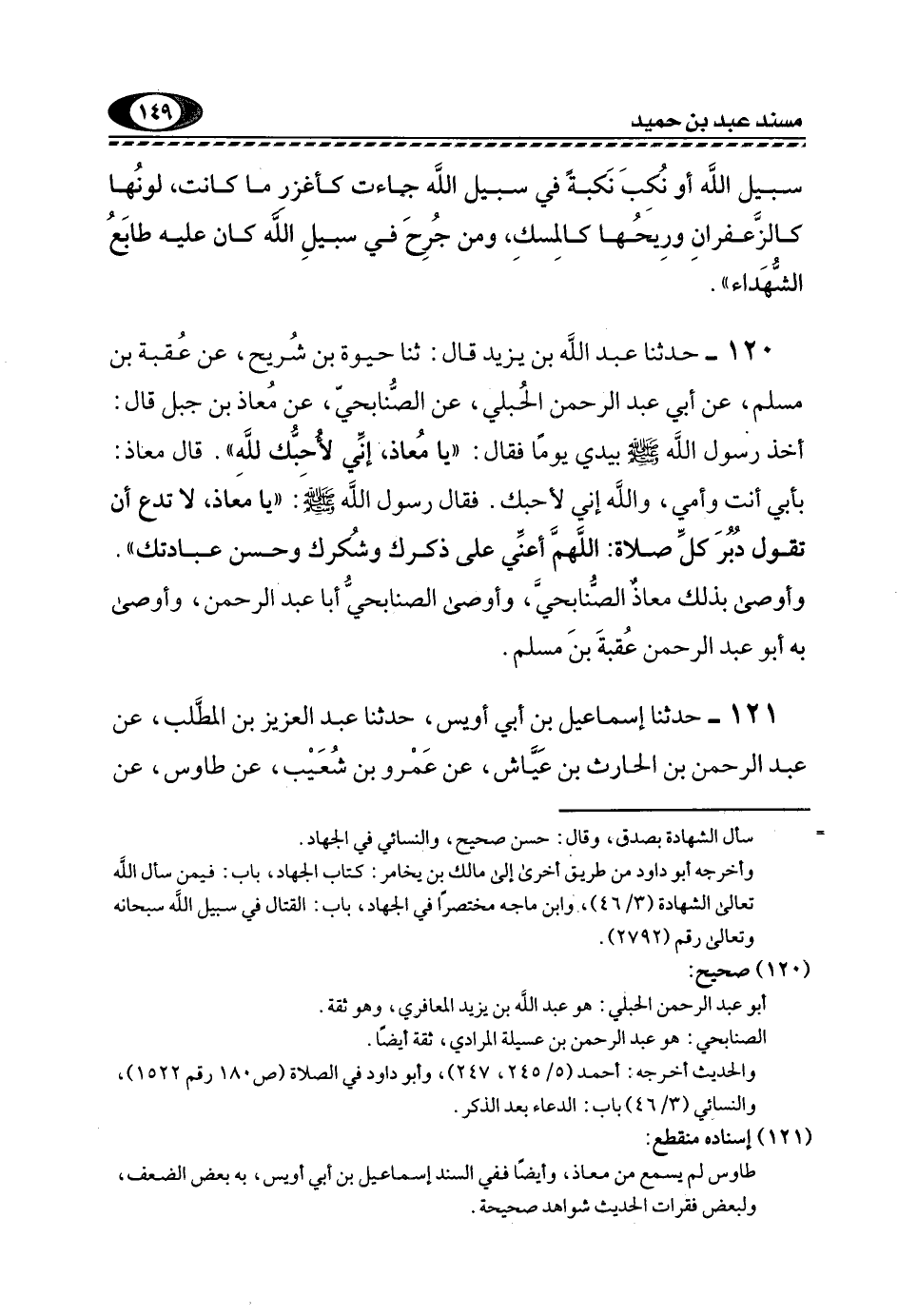 120- حَدَّثَنَا عَبْدُ اللَّهِ بْنُ يَزِيدَ قَالَ: ثَنَا حَيْوَةُ بنُ شُرَيْحٍ، عَنْ عُقْبَةَ بْنِ مُسْلِمٍ، عَنْ أَبِي عَبْدِ الرَّحْمَنِ الْحُبُلِيِّ، عَنْ الصُّنَابِحِيّ، عَنْ مُعَاذِ بْنِ جَبَلٍ قَالَ: أَخَذَ رَسُولُ اللَّهِ -صَلَّى اللهُ عَلَيْهِ وَسَلَّمَ- بِيَدِي يَوْمًا فَقَالَ: "يَا مُعَاذُ, إِنِّي لَأُحِبُّكَ لِلَّهِ". قَالَ مُعَاذٌ: بِأَبِي أَنْتَ وَأُمِّي، وَاللَّهِ إِنِّي لَأُحِبُّكَ. فَقَالَ رَسُولَ اللَّهِ صَلَّى اللهُ عَلَيْهِ وَسَلَّمَ: "يَا مُعَاذُ، لَا تَدَعْ أَنْ تَقُولَ دُبُرَ كُلِّ صَلَاةٍ: اللَّهُمَّ أعنِّي عَلَى ذِكْرِكَ وَشُكْرِكَ وَحُسْنِ عِبَادَتِكَ". وَأَوْصَى بِذَلِكَ معاذٌ الصنابحيَّ، وَأَوْصَى الصُّنَابِحِيُّ أَبَا عَبْدِ الرَّحْمَنِ، وَأَوْصَى بِهِ أَبُو عَبْدِ الرَّحْمَنِ عُقْبَةَ بْنُ مُسْلِمٍ.