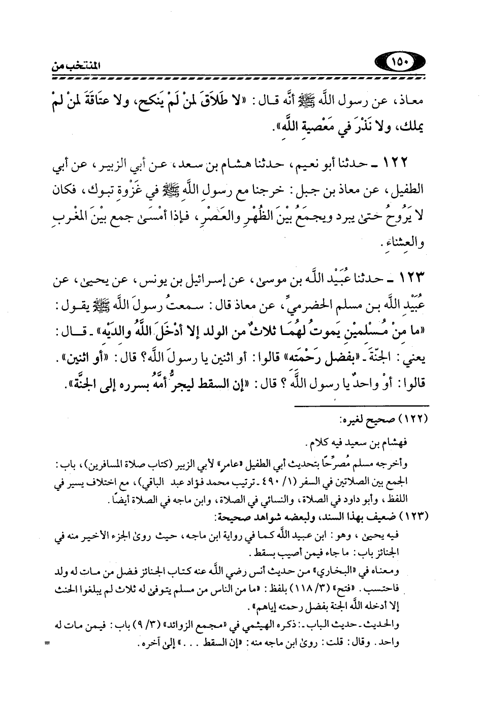 123- حَدَّثَنَا عُبَيْدُ اللَّهِ بْنُ مُوسَى، عَنْ إِسْرَائِيلَ بْنِ يُونُسَ، عَنْ يَحْيَى، عَنْ عُبَيْدِ اللَّهِ بْنِ مُسْلِمٍ الْحَضْرَمِيِّ، عَنْ مُعَاذٍ قَالَ: سَمِعْتُ رَسُولَ اللَّهِ -صَلَّى اللهُ عَلَيْهِ وَسَلَّمَ- يَقُولُ: "مَا مِنْ مسلميْنِ يَمُوتُ لهما ثلاث من الولد إِلَّا أَدْخَلَ اللَّهُ وَالِدَيْهِ" -قَالَ: يَعْنِي الْجَنَّةَ- "بِفَضْلِ رَحْمَتِهِ" قَالُوا: أَوِ اثْنَيْنِ يَا رَسُولَ اللَّهِ؟ قَالَ: "أَوِ اثْنَيْنِ". قَالُوا: أَوْ وَاحِدٌ يَا رَسُولَ اللَّهِ؟ قَالَ: "إِنَّ السِّقْطَ لَيَجُرُّ أُمَّهُ بِسَرَرِهِ إلى الجنة".
