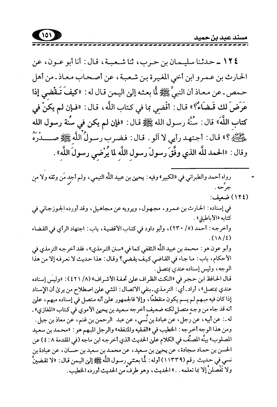 124- حَدَّثَنَا سُلَيْمَانُ بْنُ حَرْبٍ, ثَنَا شُعْبَةُ، قَالَ: أنا أَبُو عَوْنٍ، عن الحارث بن عمرو ابن أَخِي الْمُغِيرَةِ بْنِ شُعْبَةَ، عَنْ أَصْحَابِ مُعَاذٍ -مِنْ أَهْلِ حِمْصٍ- عَنْ مُعَاذٍ, أَنَّ النَّبِيَّ -صَلَّى اللهُ عَلَيْهِ وَسَلَّمَ- لَمَّا بَعَثَهُ إِلَى الْيَمَنِ قَالَ لَهُ: "كَيْفَ تقضي إذا عرض لك قَضَاءٌ؟ " قَالَ: أَقْضِي بِمَا فِي كِتَابِ اللَّهِ، قَالَ: "فَإِنْ لَمْ يَكُنْ فِي كِتَابِ اللَّهِ؟ " قَالَ: سنة رَسُولَ اللَّهِ صَلَّى اللهُ عَلَيْهِ وَسَلَّمَ, قَالَ: "فَإِنْ لَمْ يَكُنْ في سنة رَسُولَ اللَّهِ صَلَّى اللهُ عَلَيْهِ وسلم؟ " قَالَ: أَجْتَهِدُ رَأْيِي لَا آلُو. قَالَ: فَضَرَبَ رَسُولُ اللَّهِ -صَلَّى اللهُ عَلَيْهِ وَسَلَّمَ- صَدْرَهُ وَقَالَ: "الْحَمْدُ لِلَّهِ الَّذِي وَفَّقَ رَسُولَ رَسُولِ اللَّهِ لِمَا يُرْضِي رَسُولَ الله".