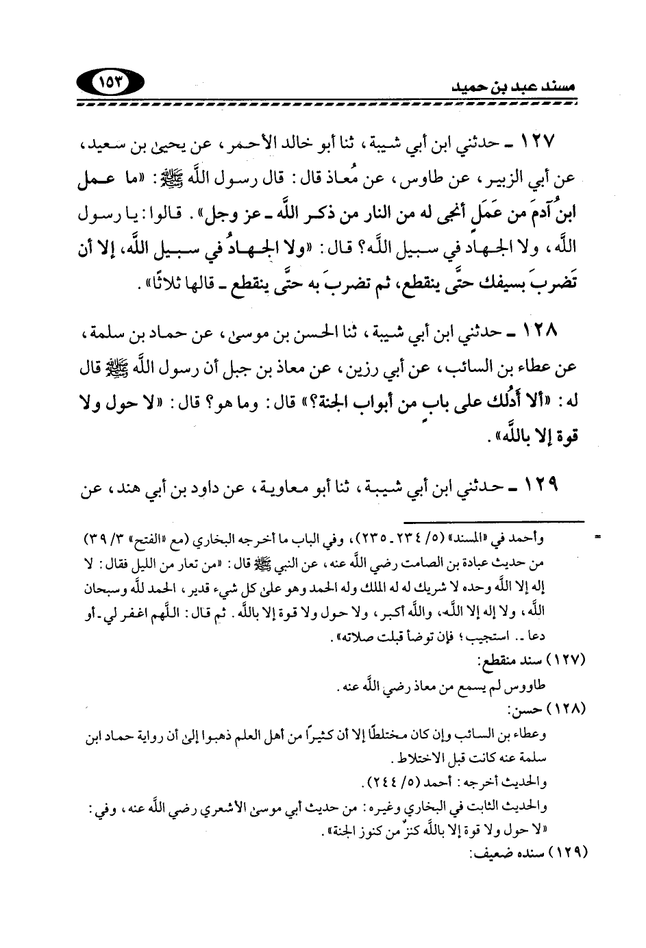 128- حَدَّثَنِي ابْنُ أَبِي شَيْبَةَ، ثَنَا الْحَسَنُ بْنُ مُوسَى، عَنْ حَمَّادِ بْنِ سَلَمَةَ، عَنْ عَطَاءِ بْنِ السَّائِبِ، عَنْ أَبِي رَزِينٍ، عَنْ مُعَاذِ بْنِ جَبَلٍ, أَنَّ رَسُولَ اللَّهِ -صَلَّى اللهُ عَلَيْهِ وَسَلَّمَ- قَالَ لَهُ: "أَلَا أَدُلُّكَ عَلَى بَابٍ مِنْ أَبْوَابِ الْجَنَّةِ؟ " قَالَ: وَمَا هُوَ؟ قَالَ: "لَا حَوْلَ وَلَا قُوَّةَ إِلَّا بِاللَّهِ".