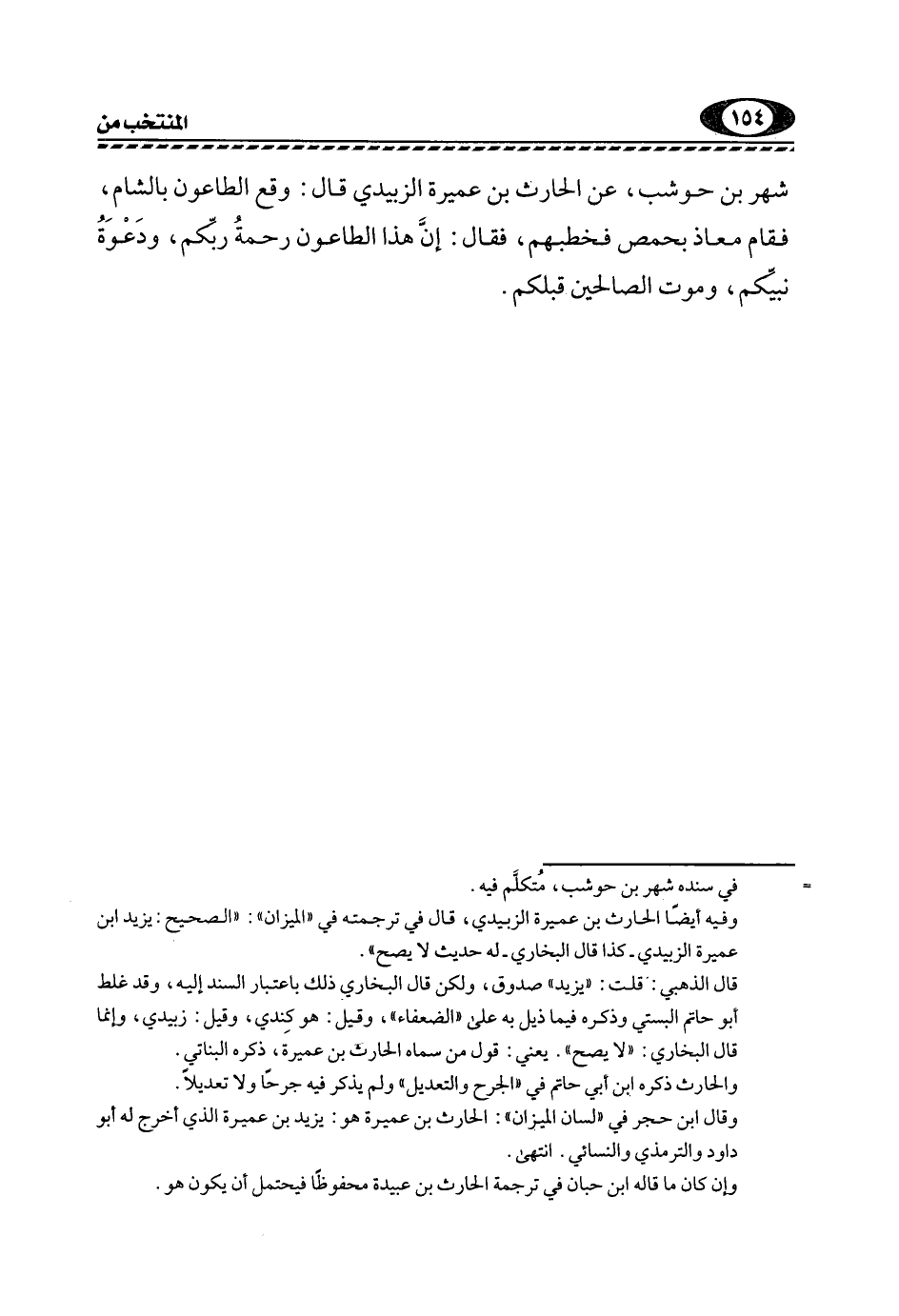 شَهْرِ بْنِ حَوْشَبٍ، عَنِ الحَارثِ بن عميرة الزُّبَيْديِّ قَالَ: وَقَعَ الطَّاعُونُ بِالشَّامِ، فَقَامَ مُعَاذٌ بِحِمْصَ فَخَطَبَهُمْ، فَقَالَ: إِنَّ هَذَا الطَّاعُونَ رَحْمَةُ رَبِّكُمْ، وَدَعْوَةُ نَبِيِّكُمْ، وَمَوْتُ الصَّالِحِينَ قَبْلَكُمْ.