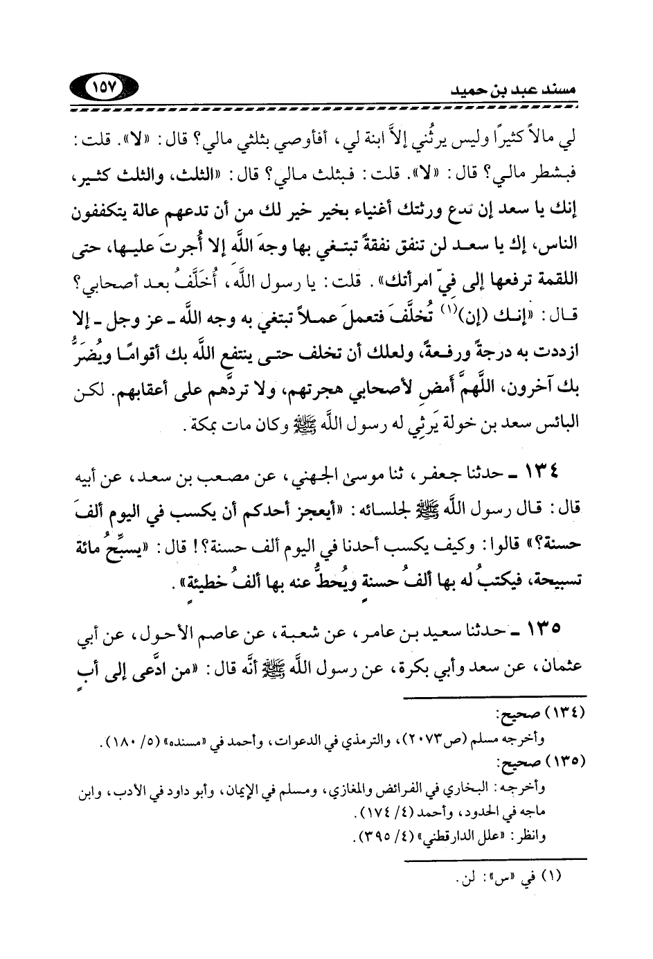 134- حَدَّثَنَا جَعْفَرٌ، ثَنَا مُوسَى الْجُهَنِيُّ، عَنْ مُصْعَبِ بْنِ سَعْدٍ، عَنْ أَبِيهِ قَالَ: قَالَ رَسُولُ اللَّهِ -صَلَّى اللهُ عَلَيْهِ وَسَلَّمَ- لِجُلَسَائِهِ: "أَيَعْجِزُ أَحَدُكُمْ أَنْ يَكْسِبَ فِي الْيَوْمِ أَلْفَ حَسَنَةٍ؟ " قَالُوا: وَكَيْفَ يَكْسِبُ أَحَدُنَا فِي الْيَوْمِ أَلْفَ حَسَنَةٍ؟! قَالَ: "يُسَبِّحُ مِائَةَ تَسْبِيحَةٍ، فَيُكْتَبُ لَهُ بِهَا أَلْفُ حَسَنَةٍ وَيُحَطُّ عَنْهُ بِهَا أَلْفُ خَطِيئَةٍ".