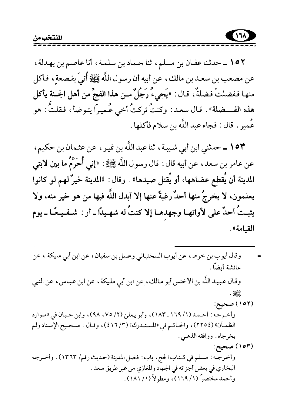 153- حَدَّثَنِي ابْنُ أَبِي شَيْبَةَ، ثَنَا عَبْدُ اللَّهِ بْنُ نُمَيْرٍ، عَنْ عُثْمَانَ بْنِ حَكِيمٍ، عَنْ عَامِرِ بْنِ سَعْدٍ، عَنْ أَبِيهِ قَالَ: قَالَ رَسُولُ اللَّهِ, صَلَّى اللهُ عَلَيْهِ وَسَلَّمَ: "إِنِّي أُحَرِّمُ مَا بَيْنَ لَابَتَيِ الْمَدِينَةِ أن يقطع عضاهها، أَوْ يُقْتَلَ صَيْدُهَا". وَقَالَ: "الْمَدِينَةُ خَيْرٌ لَهُمْ لَوْ كَانُوا يَعْلَمُونَ، لَا يَخْرُجُ مِنْهَا أَحَدٌ رَغْبَةً عَنْهَا إِلَّا أَبْدَلَ اللَّهُ فِيهَا مَنْ هُوَ خَيْرٌ مِنْهُ، وَلَا يَثْبُتُ أَحَدٌ عَلَى لَأْوَائِهَا وَجَهْدِهَا إِلَّا كنتُ لَهُ شَهِيدًا -أَوْ: شفيعا- يوم القيامة".