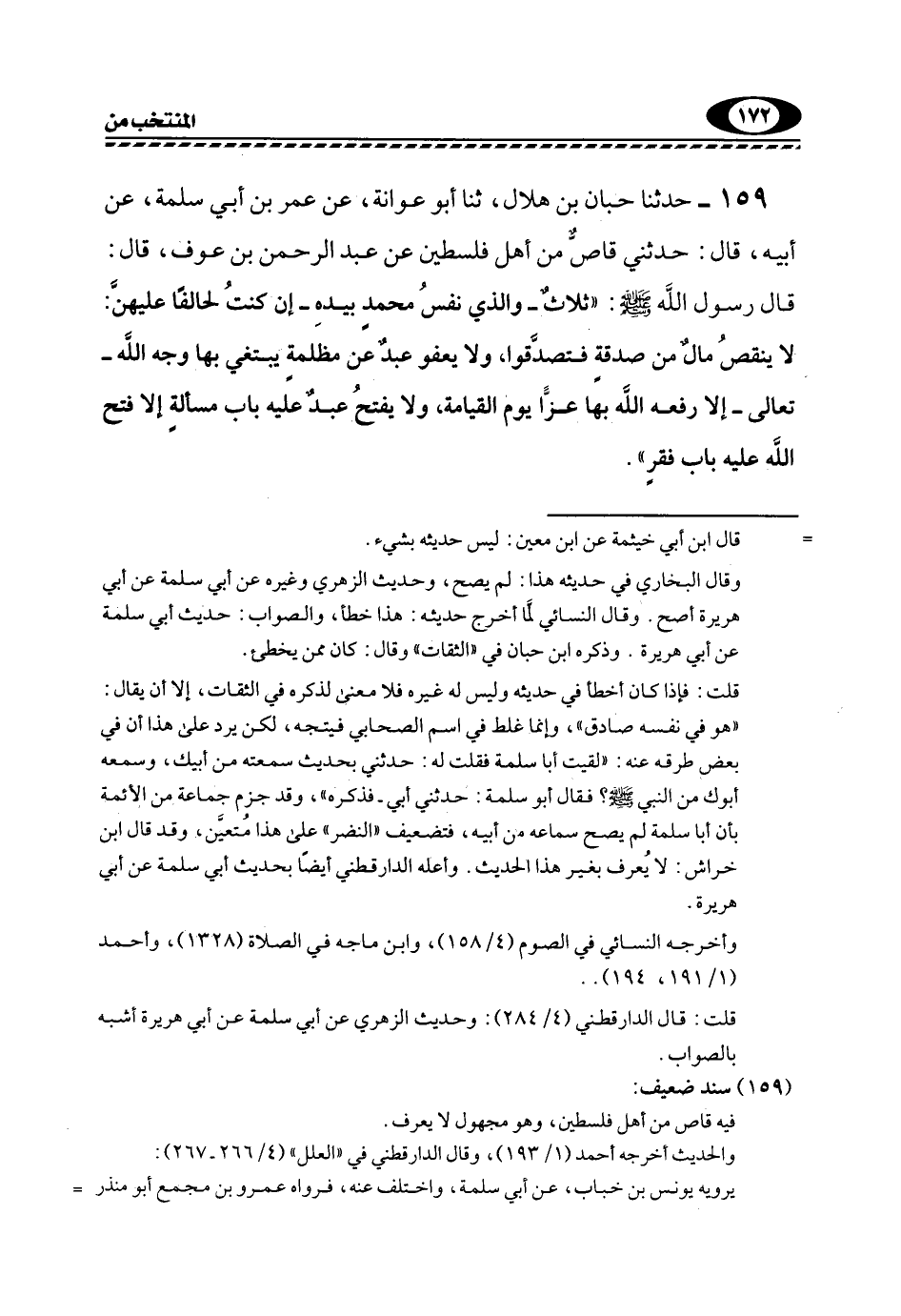 159- حَدَّثَنَا حَبَّانُ بْنُ هِلَالٍ، ثَنَا أَبُو عَوَانَةَ، عَنْ عُمَرَ بْنِ أَبِي سَلَمَةَ، عَنْ أَبِيهِ، قَالَ: حَدَّثَنِي قَاصٌّ مِنْ أَهْلِ فِلَسْطِينَ عَنْ عَبْدِ الرَّحْمَنِ بْنِ عَوْفٍ، قَالَ: قَالَ رَسُولُ اللَّهِ, صَلَّى اللهُ عَلَيْهِ وَسَلَّمَ: "ثَلَاثٌ -وَالَّذِي نَفْسُ مُحَمَّدٍ بِيَدِهِ- إِنْ كُنْتُ لَحَالِفًا عَلَيْهِنَّ: لَا يَنْقُصُ مَالٌ مِنْ صَدَقَةٍ فَتَصَدَّقُوا، وَلَا يَعْفُو عَبْدٌ عَنْ مَظْلَمَةٍ يَبْتَغِي بِهَا وَجْهَ اللَّهِ -تَعَالَى- إِلَّا رَفَعَهُ اللَّهُ بِهَا عِزًّا يَوْمَ الْقِيَامَةِ، وَلَا يَفْتَحُ عَبْدٌ عَلَيْهِ بَابَ مَسْأَلَةٍ إِلَّا فَتَحَ اللَّهُ عَلَيْهِ باب فقر".