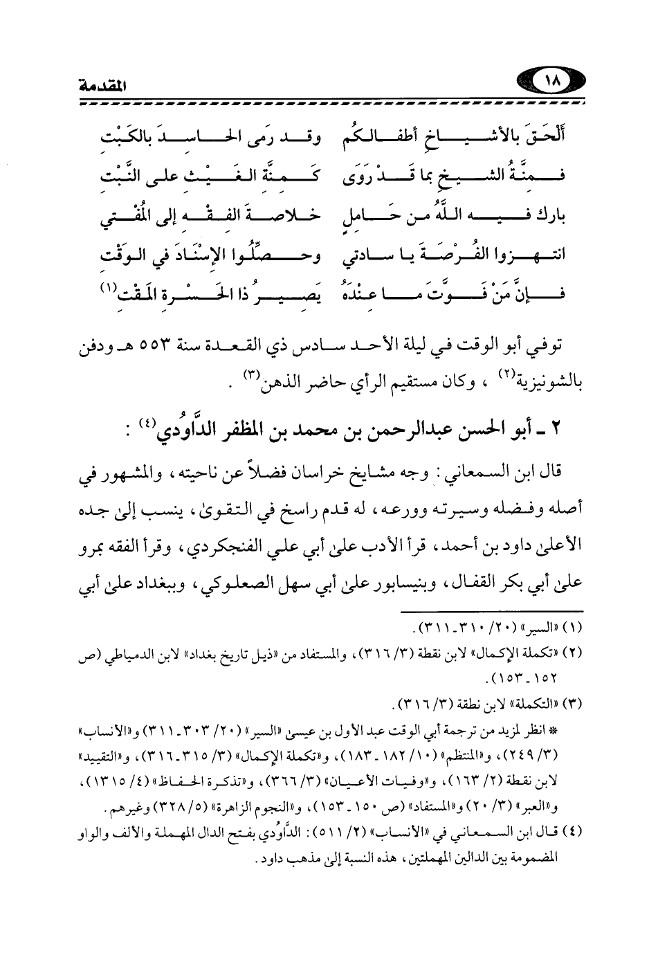 * انظر لمزيد من ترجمة أبي الوََقْتِ عَبْدُ الأَوَّلِ بنُ عِيسَى "السير" "20/ 303-311" و"الأنساب" "3/ 249"، و"المنتظم" "10/ 182, 183"، و"تكملة الإكمال" "3/ 315, 316"، و"التقييد" لابن نقطة "2/ 163"، و"وفيات الأعيان" "3/ 366"، و"تذكرة الحفاظ" "4/ 1315"، و"العبر" "3/ 20" و"المستفاد" "ص150-153"، و"النجوم الزاهرة" "5/ 328", وغيرهم.