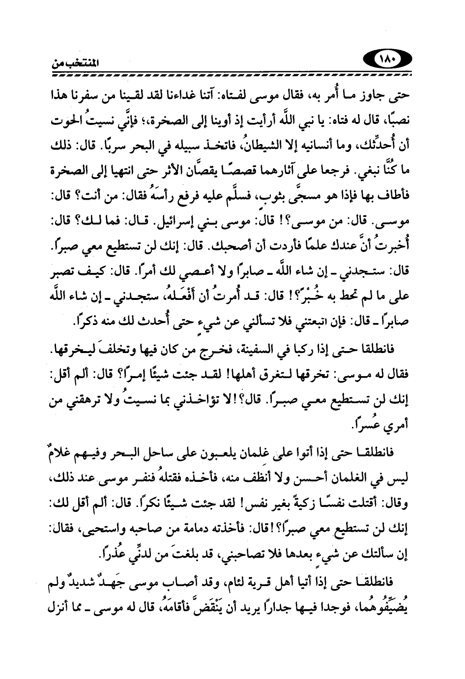 حَتَّى جَاوَزَ مَا أُمر بِهِ، فَقَالَ مُوسَى لِفَتَاهُ: {آتِنَا غَدَاءَنَا لَقَدْ لَقِينَا مِنْ سَفَرِنَا هَذَا نَصَبًا} ، وقال لَهُ فَتَاهُ: يَا نَبِيَّ اللَّهِ, أَرَأَيْتَ إِذْ أَوَيْنَا إِلَى الصَّخْرَةِ؛ فَإِنِّي نَسِيتُ الْحُوتَ أَنْ أُحَدِّثَكَ، وما أنسانيه إلا الشيطان، فَاتَّخَذَ سَبِيلَهُ فِي الْبَحْرِ سَرَبًا. قَالَ: ذَلِكَ مَا كُنَّا نَبْغِي. فَرَجَعَا عَلَى آثَارِهِمَا قَصَصًا يَقُصَّانِ الْأَثَرَ حَتَّى انْتَهَيَا إِلَى الصَّخْرَةِ, فَأَطَافَ بِهَا فَإِذَا هُوَ مُسَجًّى بِثَوْبٍ، فَسَلَّمَ عَلَيْهِ فَرَفَعَ رَأْسَهُ فَقَالَ: مَنْ أَنْتَ؟ قَالَ: مُوسَى. قَالَ: مَنْ مُوسَى؟! قَالَ: مُوسَى بَنِي إِسْرَائِيلَ. قَالَ: فَمَا لَكَ؟ قَالَ: أُخبرتُ أَنَّ عِنْدَكَ عِلْمًا فَأَرَدْتُ أَنْ أَصْحَبَكَ. {قَالَ إِنَّكَ لَنْ تَسْتَطِيعَ مَعِيَ صَبْرًا} . {قَالَ سَتَجِدُنِي إِنْ شَاءَ اللَّهُ صَابِرًا وَلا أَعْصِي لَكَ أَمْرًا} . قَالَ: كَيْفَ تَصْبِرُ عَلَى مَا لم تحط به خبرا؟ قَالَ: قَدْ أُمرت أَنْ أَفْعَلَهُ، سَتَجِدُنِي -إِنْ شَاءَ اللَّهُ- صَابِرًا, {قَالَ فَإِنِ اتَّبَعْتَنِي فَلا تَسْأَلْنِي عَنْ شَيْءٍ حَتَّى أُحْدِثَ لَكَ مِنْهُ ذِكْرًا, فَانْطَلَقَا حَتَّى إِذَا رَكِبَا فِي السَّفِينَةِ} فَخَرَجَ مِنْ كَانَ فِيهَا وَتَخَلَّفَ لِيَخْرِقَهَا, فَقَالَ لَهُ مُوسَى: تَخْرِقُهَا لِتُغْرِقَ أَهْلَهَا! لَقَدْ جِئْتَ شَيْئًا إِمْرًا؟ {قَالَ أَلَمْ أَقُلْ إِنَّكَ لَنْ تَسْتَطِيعَ مَعِيَ صَبْرًا, قَالَ لَا تُؤَاخِذْنِي بِمَا نَسِيتُ وَلا تُرْهِقْنِي مِنْ أَمْرِي عُسْرًا} .