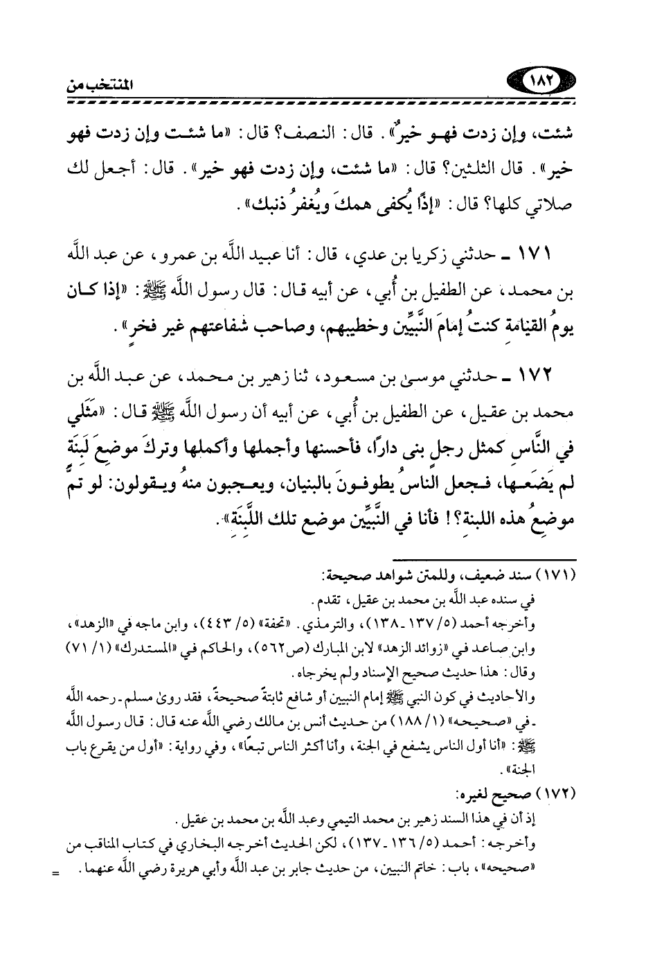 171- حَدَّثَنِي زَكَرِيَّا بْنُ عَدِيٍّ، قَالَ: أنا عُبَيْدُ اللَّهِ بْنُ عَمْرٍو، عَنْ عَبْدِ اللَّهِ بْنِ مُحَمَّدٍ، عَنِ الطُّفَيْلِ بْنِ أُبَيٍّ، عَنْ أَبِيهِ قَالَ: قَالَ رَسُولُ اللَّهِ صَلَّى اللهُ عَلَيْهِ وَسَلَّمَ: "إِذَا كَانَ يَوْمُ الْقِيَامَةِ كُنْتُ إِمَامَ النَّبِيِّينَ وَخَطِيبَهُمْ، وَصَاحِبَ شَفَاعِتِهِمْ غَيْرُ فَخْرٍ".
