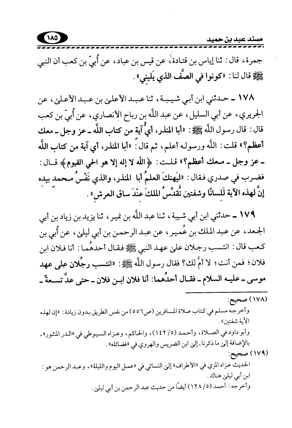 178- حَدَّثَنِي ابْنُ أَبِي شَيْبَةَ، ثَنَا عَبْدُ الْأَعْلَى بْنُ عَبْدِ الْأَعْلَى، عَنِ الْجُرَيْرِيِّ، عَنْ أَبِي السَّلِيلِ، عَنْ عَبْدِ اللَّهِ بْنِ رَبَاحٍ الْأَنْصَارِيِّ، عَنْ أُبَيِّ بْنِ كَعْبٍ قَالَ: قَالَ رَسُولُ اللَّهِ, صَلَّى اللهُ عَلَيْهِ وَسَلَّمَ: "أَبَا الْمُنْذِرِ، أَيُّ آيَةٍ مِنْ كِتَابِ اللَّهِ -عَزَّ وَجَلَّ- مَعَكَ أَعْظَمُ؟ " قُلْتُ: اللَّهُ وَرَسُولُهُ أَعْلَمُ، ثُمَّ قَالَ: "أَبَا الْمُنْذِرِ، أَيُّ آيَةٍ مِنْ كِتَابِ اللَّهِ -عَزَّ وَجَلَّ- مَعَكَ أَعْظَمُ؟ " قُلْتُ: {اللَّهُ لَا إِلَهَ إِلَّا هُوَ الْحَيُّ الْقَيُّومُ} قَالَ: فَضَرَبَ فِي صَدْرِي فَقَالَ: "لِيَهْنِكَ الْعِلْمُ أَبَا الْمُنْذِرِ، وَالَّذِي نَفْسُ مُحَمَّدٍ بِيَدِهِ, إِنْ لِهَذِهِ الْآيَةِ لَلِسَانًا وَشَفَتَيْنِ تُقَدِّسُ الْمَلِكَ عِنْدَ سَاقِ الْعَرْشِ".