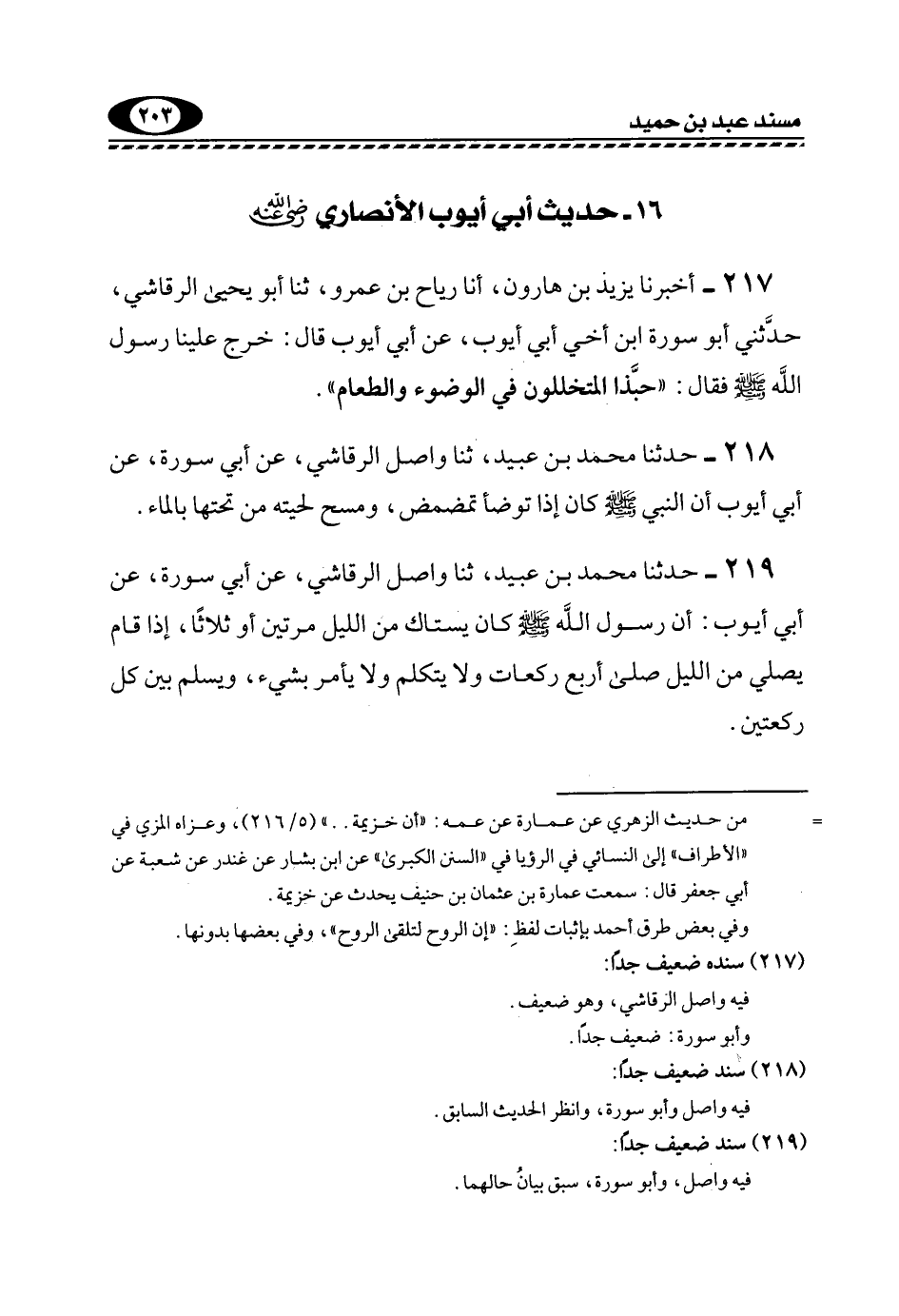 217- أَخْبَرَنَا يَزِيدُ بْنُ هَارُونَ، أنا رِيَاحُ بْنُ عَمْرٍو، ثنا أَبُو يَحْيَى الرَّقَّاشِيُّ، حَدَّثَنِي أَبُو سَوْرَةَ ابْنُ أَخِي أَبِي أَيُّوبَ، عَنْ أَبِي أَيُّوبَ قَالَ: خَرَجَ عَلَيْنَا رَسُولُ اللَّهِ -صَلَّى اللهُ عَلَيْهِ وَسَلَّمَ- فَقَالَ: "حَبَّذَا الْمُتَخَلِّلُونَ فِي الْوُضُوءِ, وَالطَّعَامِ".