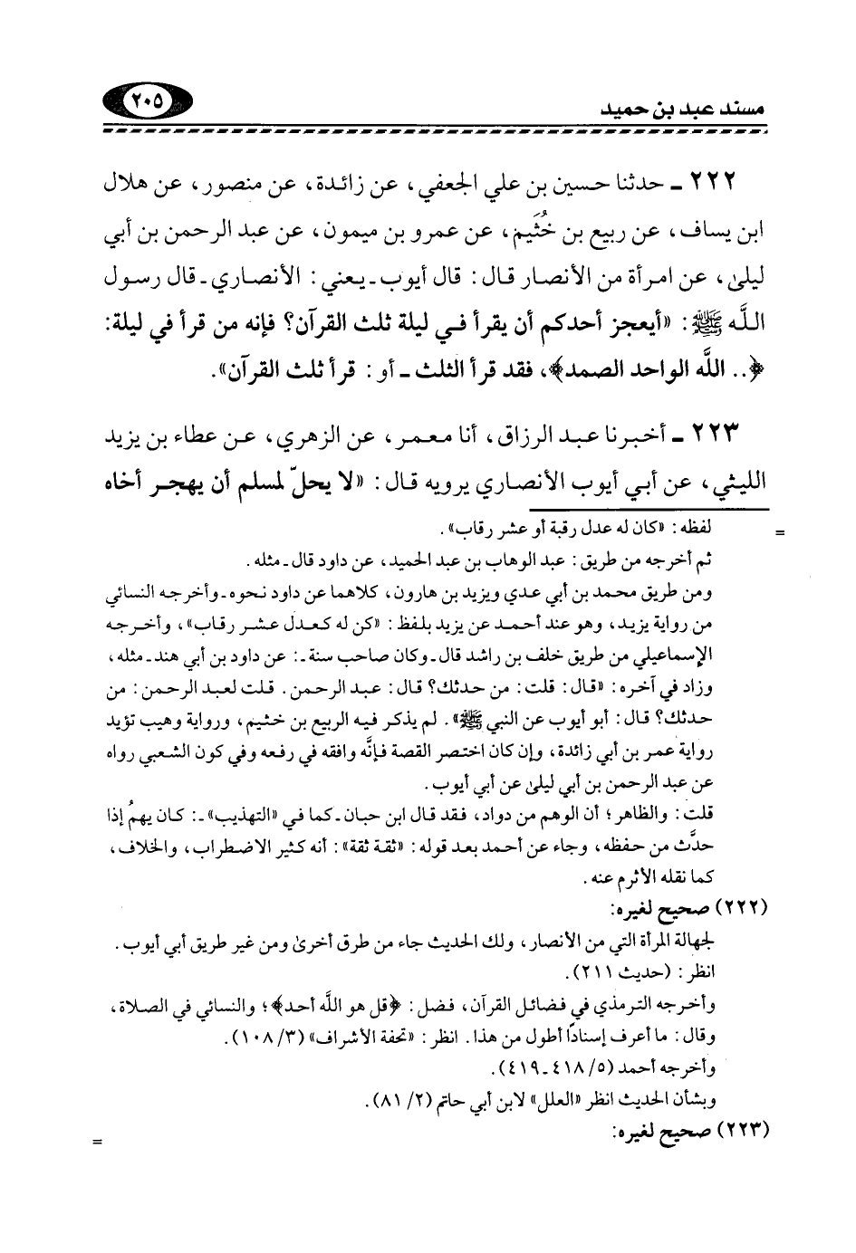 222- حَدَّثَنَا حُسَيْنُ بْنُ عَلِيٍّ الْجُعْفِيُّ، عَنْ زَائِدَةَ، عَنْ مَنْصُورٍ، عَنْ هِلَالِ بْنِ يَسَافٍ، عَنْ رَبِيعِ بْنِ خُثَيْمٍ، عَنْ عَمْرِو بْنِ مَيْمُونٍ، عَنْ عَبْدِ الرَّحْمَنِ بْنِ أَبِي لَيْلَى، عَنِ امْرَأَةٍ مِنَ الأنصار قال: قال أَيُّوبَ, يَعْنِي: الْأَنْصَارِيَّ: قَالَ رَسُولُ اللَّهِ صَلَّى اللهُ عَلَيْهِ وَسَلَّمَ: "أَيَعْجِزُ أَحَدُكُمْ أَنْ يَقْرَأَ فِي لَيْلَةٍ ثُلُثَ الْقُرْآنِ؟ فَإِنَّهُ مَنْ قَرَأَ فِي لَيْلَةٍ: " ... اللَّهُ الْوَاحِدُ الصَّمَدُ"، فَقَدْ قَرَأَ الثُّلُثَ, أَوْ: قَرَأَ ثُلُثَ الْقُرْآنِ".