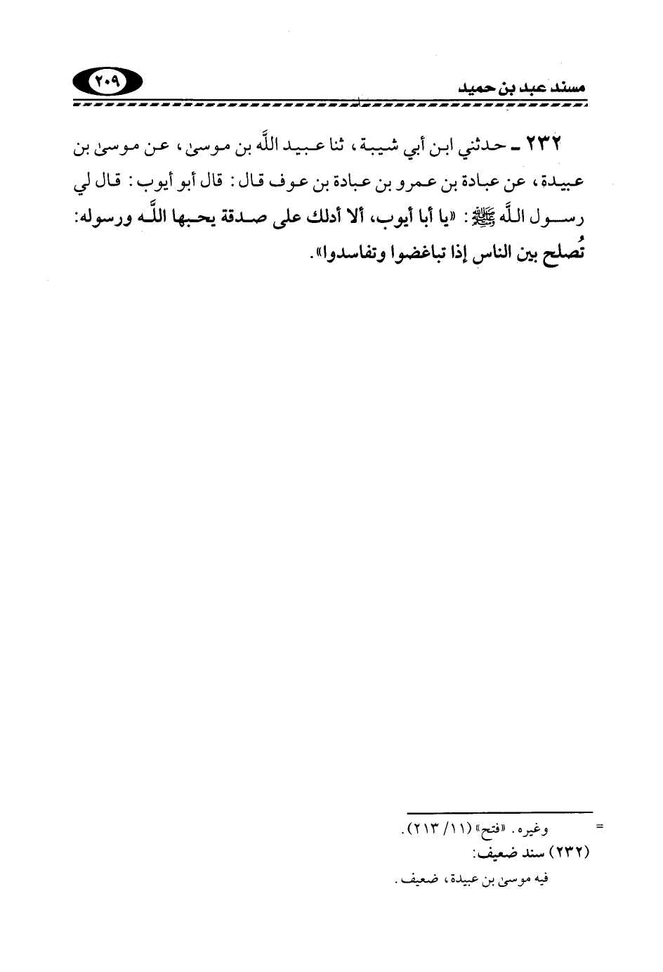 232- حَدَّثَنِي ابْنُ أَبِي شَيْبَةَ، ثَنَا عُبَيْدُ اللَّهِ بْنُ مُوسَى، عَنْ مُوسَى بْنُ عُبَيْدَةَ، عَنْ عُبَادَةَ بْنِ عمرو بن عبادة بن عَوْفٍ قَالَ: قَالَ أَبُو أَيُّوبَ: قَالَ لِي رَسُولُ اللَّهِ, صَلَّى اللهُ عَلَيْهِ وَسَلَّمَ: "يَا أَبَا أَيُّوبَ، أَلَا أَدُلُّكَ عَلَى صَدَقَةٍ يُحِبُّهَا اللَّهُ وَرَسُولُهُ: تُصْلِحُ بَيْنَ الناس إذا تباغضوا, وتفاسدوا".