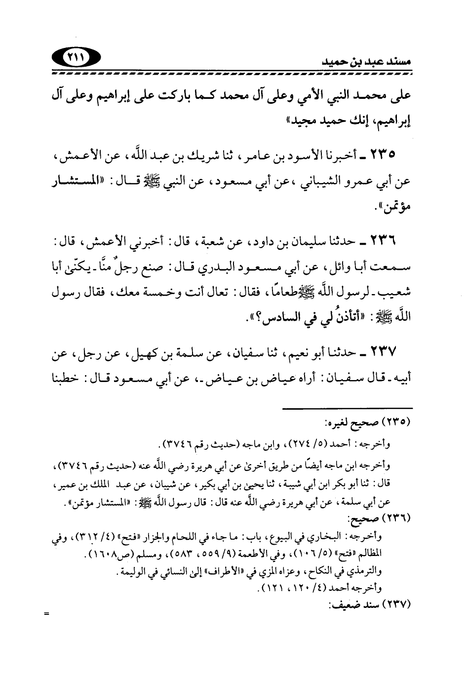 235- أَخْبَرَنَا الْأَسْوَدُ بْنُ عَامِرٍ، ثَنَا شَرِيكُ بْنُ عَبْدِ اللَّهِ، عَنِ الْأَعْمَشِ، عَنْ أَبِي عَمْرٍو الشَّيْبَانِيِّ، عَنْ أَبِي مَسْعُودٍ، عَنِ النَّبِيِّ -صَلَّى اللهُ عَلَيْهِ وَسَلَّمَ- قَالَ: "الْمُسْتَشَارُ مُؤْتَمَنٌ".