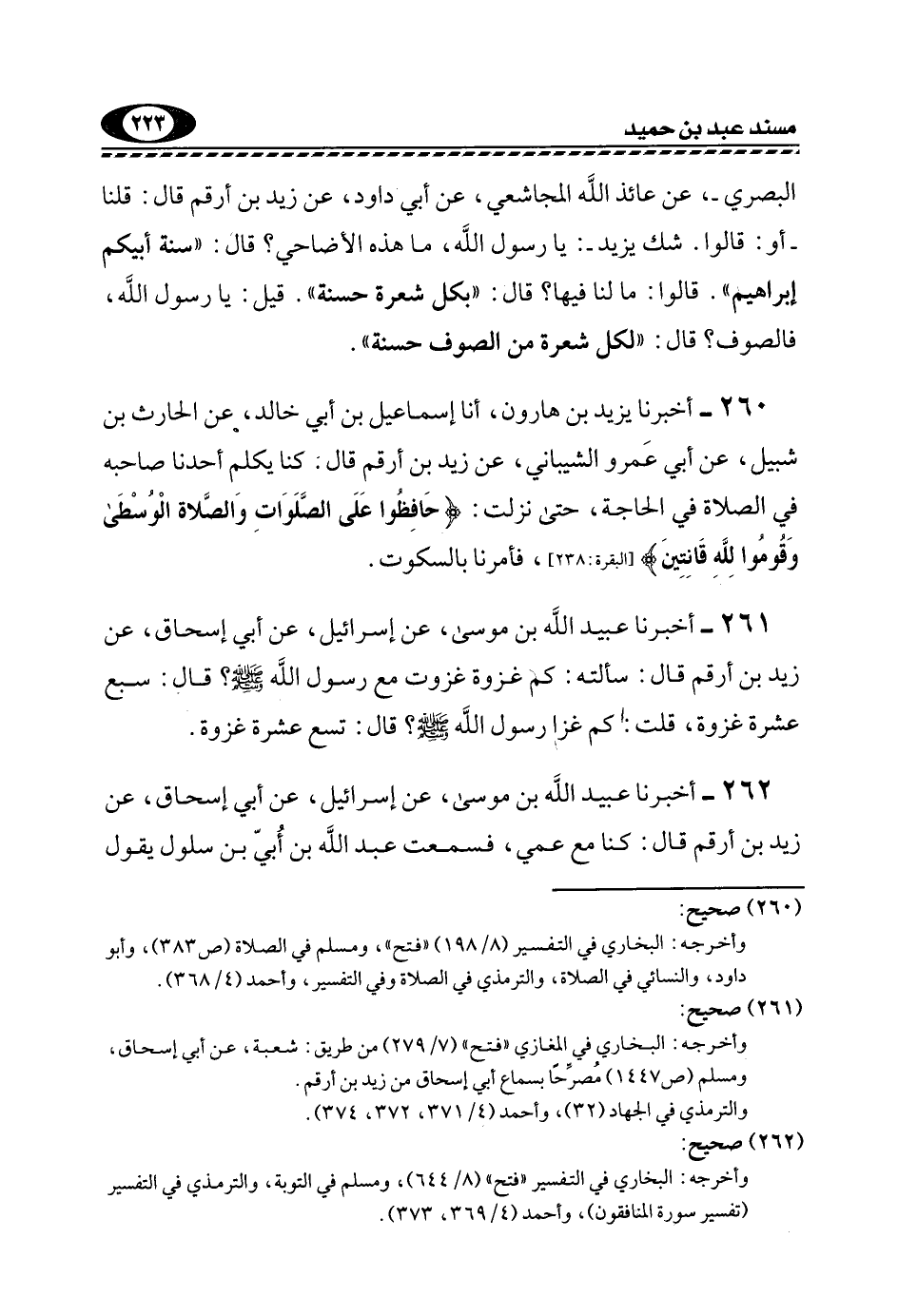 260- أَخْبَرَنَا يَزِيدُ بْنُ هَارُونَ، أنا إِسْمَاعِيلُ بْنُ أَبِي خَالِدٍ، عَنِ الْحَارِثِ بْنِ شُبَيْلٍ، عَنْ أَبِي عَمْرٍو الشَّيْبَانِيِّ، عَنْ زَيْدِ بْنِ أَرْقَمَ قَالَ: كُنَّا يُكَلِّمُ أَحَدُنَا صَاحِبَهُ فِي الصَّلَاةِ فِي الْحَاجَةِ، حَتَّى نَزَلَتْ: {حَافِظُوا عَلَى الصَّلَوَاتِ وَالصَّلاةِ الْوُسْطَى وَقُومُوا لِلَّهِ قَانِتِينَ} [البقرة: 238] ، فَأُمِرْنَا بِالسُّكُوتِ.
