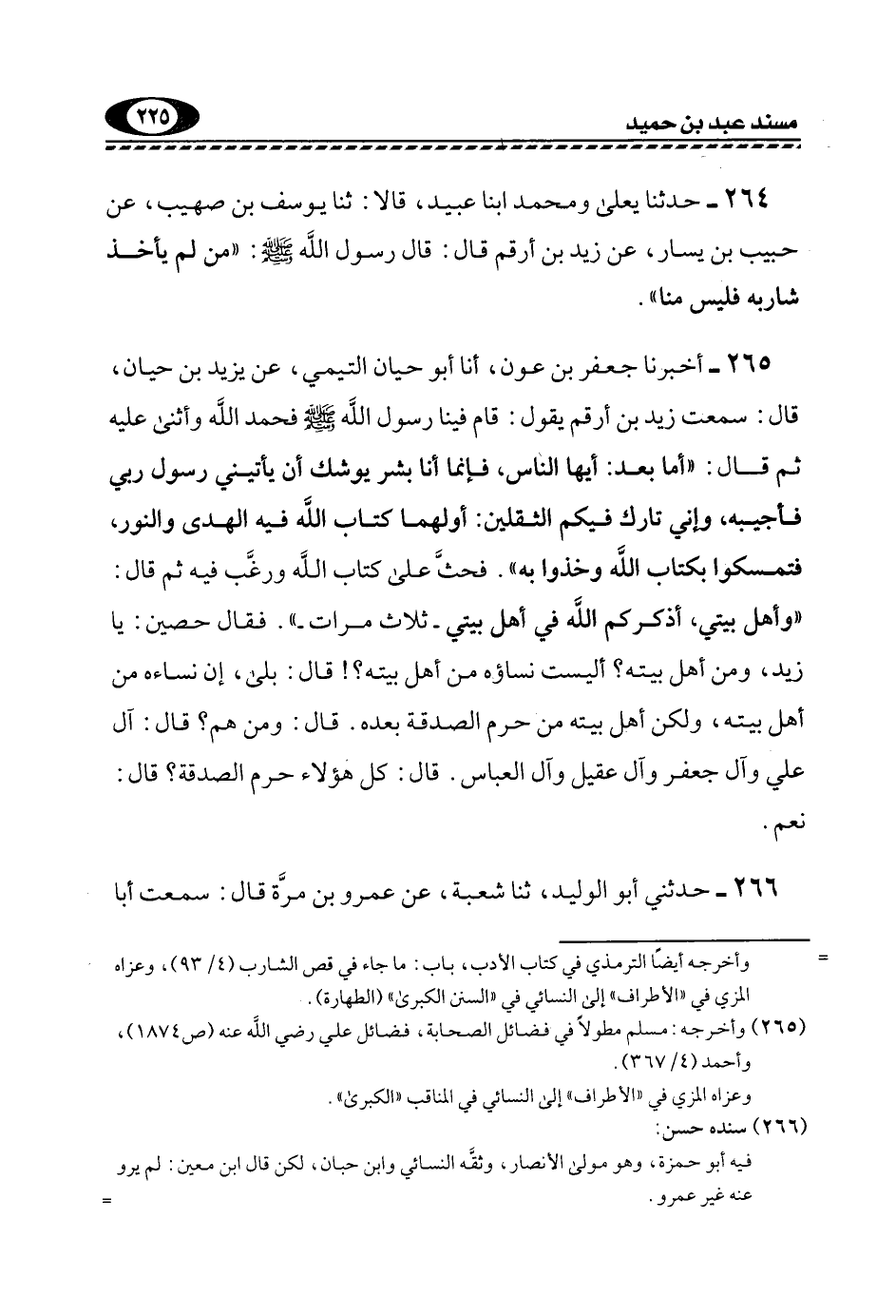 265- أَخْبَرَنَا جَعْفَرُ بْنُ عَوْنٍ، أنا أَبُو حَيَّانَ التَّيْمِيُّ، عَنْ يَزِيدَ بْنِ حَيَّانَ، قَالَ: سَمِعْتُ زَيْدَ بْنَ أَرْقَمَ يَقُولُ: قَامَ فِينَا رَسُولُ اللَّهِ -صَلَّى اللهُ عَلَيْهِ وَسَلَّمَ- فَحَمِدَ اللَّهَ وَأثْنَى عَلَيْهِ ثُمَّ قَالَ: "أَمَّا بَعْدُ: أَيُّهَا النَّاسُ، فَإِنَّمَا أَنَا بَشَرٌ يُوشِكُ أَنْ يَأْتِيَنِي رَسُولُ رَبِّي فَأُجِيبَهُ، وَإِنِّي تَارِكٌ فِيكُمُ الثَّقَلَيْنِ: أَوَّلُهُمَا كِتَابُ اللَّهِ فِيهِ الْهُدَى وَالنُّورُ، فَتَمَسَّكُوا بِكِتَابِ اللَّهِ وَخُذُوا بِهِ". فَحَثَّ عَلَى كِتَابِ اللَّهِ وَرَغَّبَ فِيهِ ثُمَّ قَالَ: "وَأَهْلُ بَيْتِي، أُذَكِّرُكُمُ اللَّهَ فِي أَهْلِ بَيْتِي, ثَلَاثَ مَرَّاتٍ". فَقَالَ حُصَيْنٌ: يَا زَيْدُ، وَمَنْ أَهْلُ بَيْتِهِ؟ أَلَيْسَتْ نِسَاؤُهُ مِنْ أَهْلِ بَيْتِهِ؟! قَالَ: بَلَى، إِنَّ نِسَاءَهُ مِنْ أَهْلِ بَيْتِهِ، وَلَكِنَّ أَهْلَ بَيْتِهِ مَنْ حُرِمَ الصَّدَقَةَ بَعْدَهُ. قَالَ: وَمَنْ هُمْ؟ قَالَ: آلُ عَلِيٍّ وَآلُ جَعْفَرٍ وَآلُ عَقِيلٍ وَآلُ الْعَبَّاسِ. قَالَ: كُلُّ هَؤُلَاءِ حُرِمَ الصَّدَقَةَ؟ قَالَ: نَعَمْ.