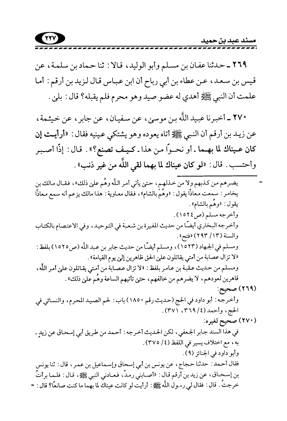 269- حَدَّثَنَا عَفَّانُ بْنُ مُسْلِمٍ وَأَبُو الْوَلِيدِ، قَالَا: ثَنَا حَمَّادُ بْنُ سَلَمَةَ، عَنْ قَيْسِ بْنِ سَعْدٍ، عَنْ عَطَاءِ بْنِ أَبِي رَبَاحٍ, أَنَّ ابْنَ عَبَّاسٍ قَالَ لِزَيْدِ بْنِ أَرْقَمَ: أَمَا عَلِمْتَ أَنَّ النَّبِيَّ -صَلَّى اللهُ عَلَيْهِ وَسَلَّمَ- أُهْدِيَ لَهُ عُضْوُ صِيدٍ وَهُوَ مُحْرِمٌ, فَلَمْ يَقْبَلْهُ؟ قَالَ: بَلَى.
