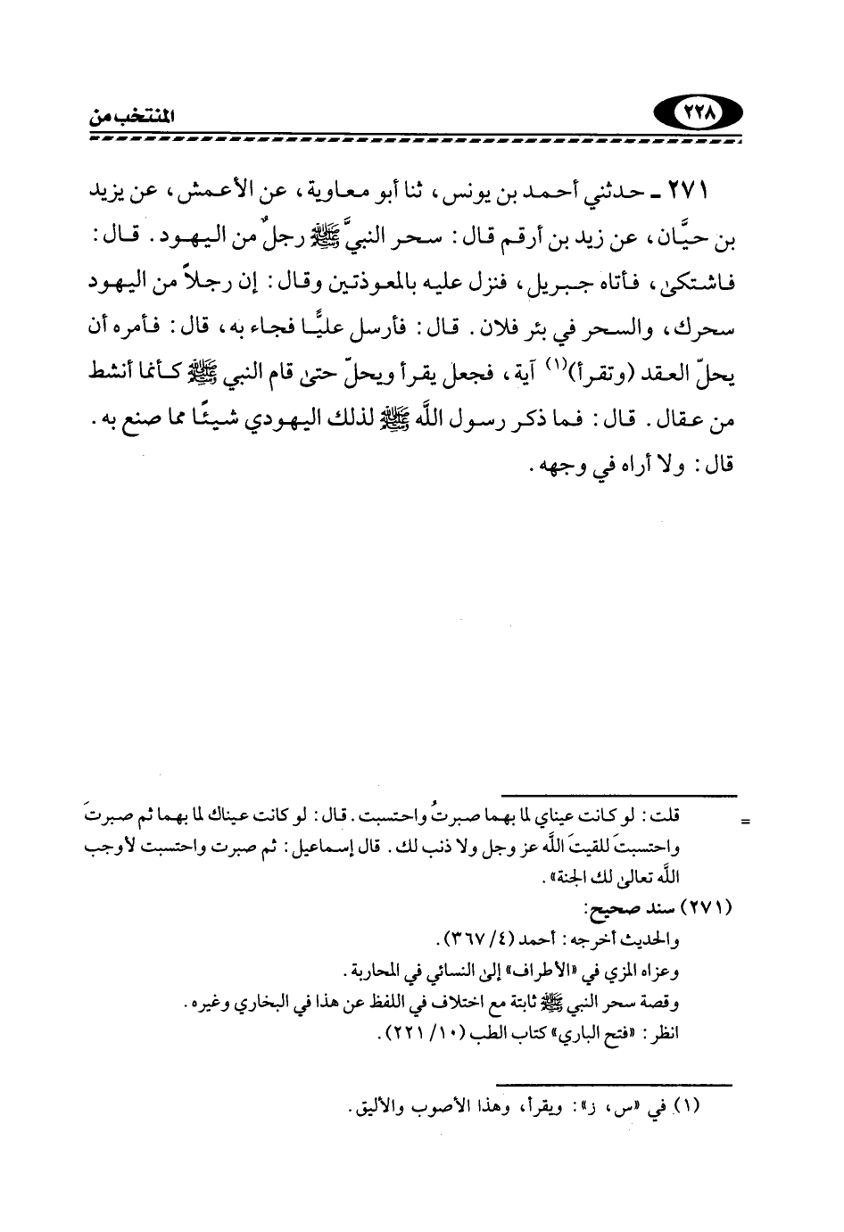 271- حَدَّثَنِي أَحْمَدُ بْنُ يُونُسَ، ثَنَا أَبُو مُعَاوِيَةَ، عَنِ الْأَعْمَشِ، عَنْ يَزِيدَ بْنِ حَيَّانَ، عَنْ زَيْدِ بْنِ أَرْقَمَ قَالَ: سَحَرَ النَّبِيَّ -صَلَّى اللهُ عَلَيْهِ وَسَلَّمَ- رَجُلٌ مِنَ الْيَهُودِ. قَالَ: فَاشْتَكَى، فَأَتَاهُ جِبْرِيلُ، فَنَزَلَ عَلَيْهِ بِالْمُعَوِّذَتَيْنِ وَقَالَ: "إِنَّ رَجُلًا مِنَ الْيَهُودِ سَحَرَكَ، وَالسِّحْرُ فِي بِئْرِ فُلَانٍ". قَالَ: فَأَرْسَلَ عَلِيًّا فَجَاءَ بِهِ، قَالَ: فَأَمَرَهُ أَنْ يَحُلَّ الْعُقَدَ "وَتَقْرَأَ"1 آيَةً، فَجَعَلَ يَقْرَأُ وَيَحُلُّ, حَتَّى قَامَ النَّبِيُّ -صَلَّى اللهُ عَلَيْهِ وَسَلَّمَ- كَأَنَّمَا أُنْشِطَ مِنْ عِقَالٍ. قَالَ: فَمَا ذَكَرَ رَسُولُ اللَّهِ -صَلَّى اللهُ عَلَيْهِ وَسَلَّمَ- لِذَلِكَ الْيَهُودِيِّ شَيْئًا مِمَّا صَنَعَ بِهِ. قَالَ: وَلَا أَرَاهُ فِي وَجْهِهِ.