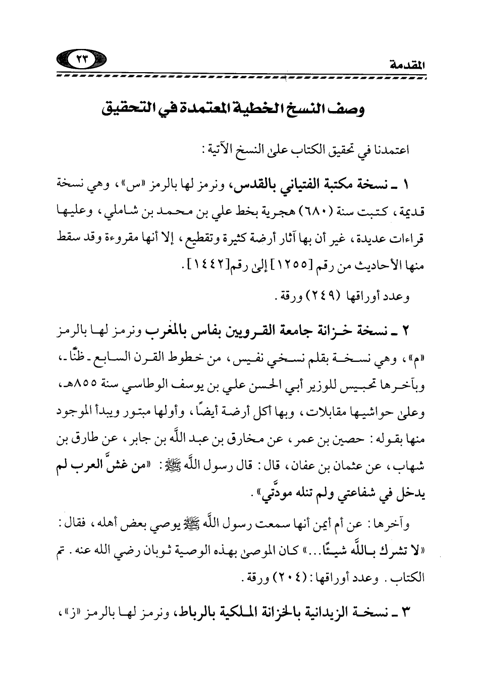 2- نسخة خزانة جامعة القرويين بفاس بالمغرب, ونرمز لها بالرمز "م"، وهي نسخة بقلم نسخي نفيس، من خطوط القرن السابع -ظنا- وبآخرها تحبيس للوزير أبي الحسن علي بن يوسف الوطاسي سنة 855هـ، وعلى حواشيها مقابلات، وبها أكل أرضة أيضا، وأولها مبتور, ويبدأ الموجود منها بقوله: حُصَيْنِ بْنِ عُمَرَ، عَنْ مُخَارِقِ بْنِ عَبْدِ اللَّهِ بْنِ جَابِرٍ، عَنْ طَارِقِ بْنِ شِهَابٍ، عَنْ عُثْمَانَ بْنِ عَفَّانَ، قَالَ: قَالَ رَسُولَ اللَّهِ صَلَّى اللهُ عَلَيْهِ وَسَلَّمَ: "مَنْ غَشَّ الْعَرَبَ لَمْ يَدْخُلْ فِي شَفَاعَتِي, وَلَمْ تَنَلْهُ مودتي".