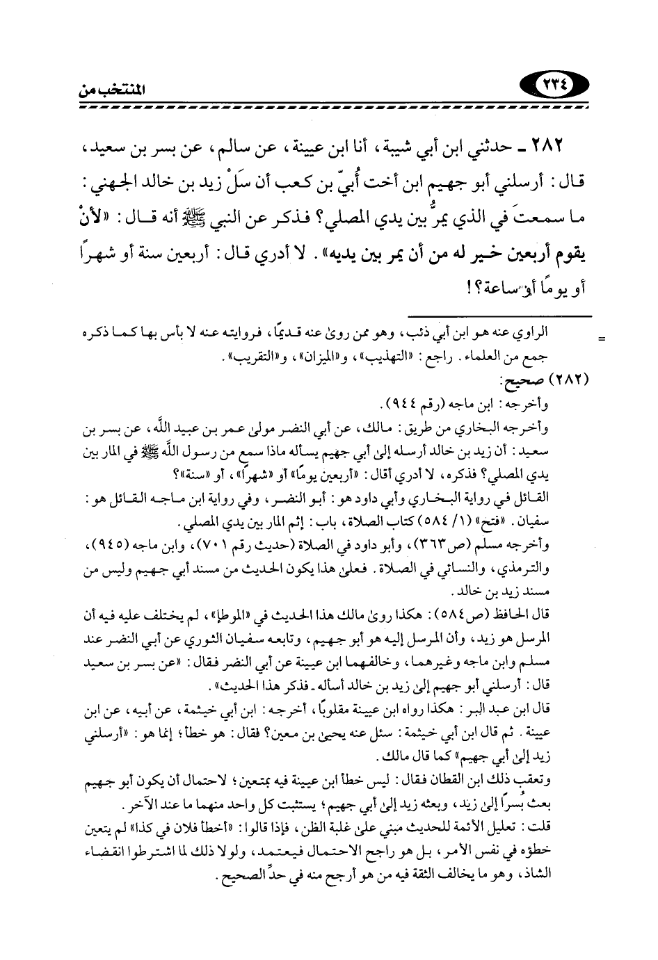 282- حَدَّثَنِي ابْنُ أَبِي شَيْبَةَ، أَنَا ابْنُ عُيَيْنَةَ، عَنْ سَالِمٍ، عَنْ بُسْرِ بْنِ سَعِيدٍ، قَالَ: أَرْسَلَنِي أَبُو جُهَيْمِ ابْنُ أُخْتِ أُبَيِّ بْنِ كَعْبٍ أَنْ سَلْ زَيْدَ بْنَ خَالِدٍ الْجُهَنِيَّ: مَا سَمِعْتَ فِي الَّذِي يَمُرُّ بَيْنَ يَدَيِ الْمُصَلِّي؟ فَذَكَرَ عَنِ النَّبِيِّ -صَلَّى اللهُ عَلَيْهِ وَسَلَّمَ- أَنَّهُ قَالَ: "لَأَنْ يَقُومَ أَرْبَعِينَ خَيْرٌ لَهُ مِنْ أَنْ يَمُرَّ بَيْنَ يَدَيْهِ". لَا أَدْرِي قَالَ: أَرْبَعِينَ سَنَةً أَوْ شَهْرًا أَوْ يَوْمًا أَوْ ساعة؟!