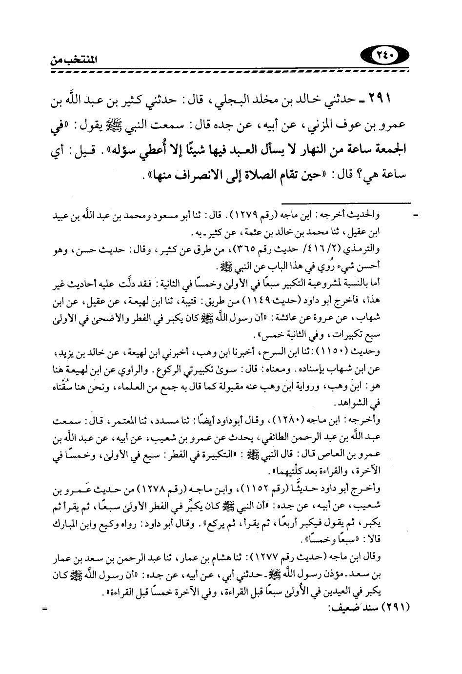 291- حَدَّثَنِي خَالِدُ بْنُ مَخْلَدٍ الْبَجَلِيُّ، قَالَ: حَدَّثَنِي كَثِيرُ بْنُ عَبْدِ اللَّهِ بْنِ عَمْرِو بْنِ عَوْفٍ الْمُزَنِيُّ، عَنْ أَبِيهِ، عَنْ جَدِّهِ قَالَ: سَمِعْتُ النَّبِيَّ -صَلَّى اللهُ عَلَيْهِ وَسَلَّمَ- يَقُولُ: "فِي الْجُمُعَةِ سَاعَةٌ مِنَ النَّهَارِ, لَا يَسْأَلُ الْعَبْدُ فِيهَا شَيْئًا إِلَّا أُعْطِيَ سُؤْلَهُ". قِيلَ: أَيُّ سَاعَةٍ هِيَ؟ قَالَ: "حِينَ تُقَامُ الصَّلَاةُ إِلَى الانصراف منها".