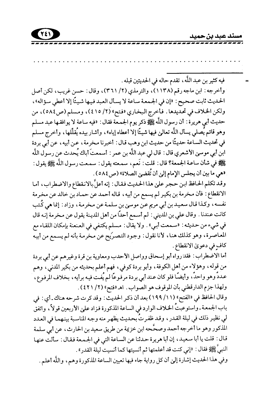 وقال الحافظ في "الفتح" "11/ 199" بعد أن ذكر الحديث: وقد ذكرت شرحه هناك -أي: في باب الجمعة- واستوعبت الخلاف الوارد في الساعة المذكورة, فزاد على الأربعين قولا، واتفق لي نظير ذلك في ليلة القدر، وقد ظفرت بحديث يظهر منه وجه المناسبة بينهما في العدد المذكور وهو ما أخرجه أحمد وصححه ابن خزيمة من طريق سعيد بن الحارث، عن أبي سلمة قال: قلت: يا أبا سعيد، إن أبا هريرة حدثنا عن الساعة التي في الجمعة فقال: سألت عنها النَّبِيَّ -صَلَّى اللهُ عَلَيْهِ وَسَلَّمَ- فقال: "إني كنت قد أعلمتها, ثم أنسيتها كما أنسيت ليلة القدر".
