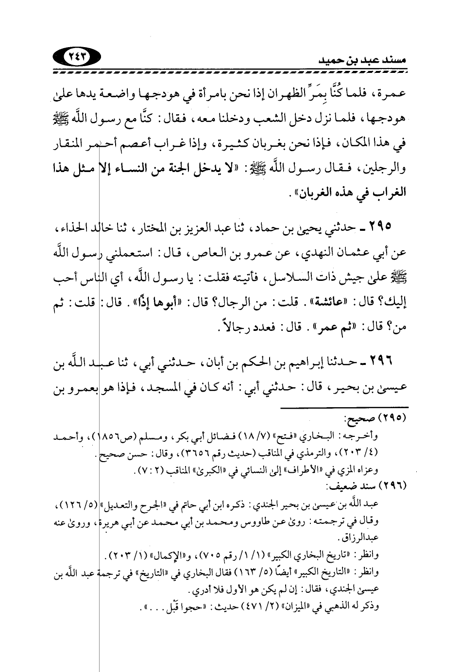 295- حَدَّثَنِي يَحْيَى بْنُ حَمَّادٍ، ثَنَا عَبْدُ الْعَزِيزِ بْنُ الْمُخْتَارِ، ثَنَا خَالِدٌ الْحَذَّاءُ، عَنْ أَبِي عُثْمَانَ النَّهْدِيِّ، عَنْ عَمْرِو بْنِ الْعَاصِ، قَالَ: اسْتَعْمَلَنِي رَسُولُ اللَّهِ -صَلَّى اللهُ عَلَيْهِ وَسَلَّمَ- عَلَى جَيْشِ ذَاتِ السَّلَاسِلِ، فَأَتَيْتُهُ فَقُلْتُ: يَا رَسُولَ اللَّهِ، أَيُّ النَّاسِ أَحَبُّ إِلَيْكَ؟ قَالَ: "عَائِشَةُ". قُلْتُ: مِنَ الرِّجَالِ؟ قَالَ: "أَبُوهَا إِذًا". قَالَ: قُلْتُ: ثُمَّ مَنْ؟ قَالَ: "ثُمَّ عُمَرُ". قَالَ: فَعَدَّدَ رِجَالًا.