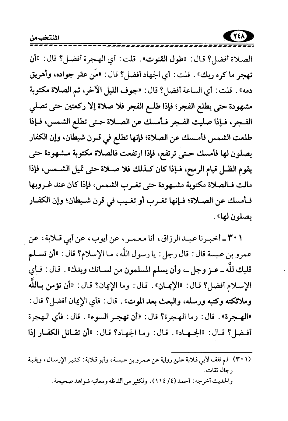 الصَّلَاةِ أَفْضَلُ؟ قَالَ: "طُولُ الْقُنُوتِ". قُلْتُ: أَيُّ الْهِجْرَةِ أَفْضَلُ؟ قَالَ: "أَنْ تَهْجُرَ مَا كَرِهَ رَبُّكَ". قُلْتُ: أَيُّ الْجِهَادِ أَفْضَلُ؟ قَالَ: "مَنْ عُقِرَ جَوَادُهُ، وَأُهْرِيقَ دَمُهُ". قُلْتُ: أَيُّ السَّاعَةِ أَفْضَلُ؟ قَالَ: "جَوْفُ اللَّيْلِ الْآخِرِ، ثُمَّ الصَّلَاةُ مَكْتُوبَةٌ مَشْهُودَةٌ حَتَّى يَطْلُعَ الْفَجْرُ؛ فَإِذَا طَلَعَ الْفَجْرُ فَلَا صَلَاةَ إِلَّا رَكْعَتَيْنِ حَتَّى تُصَلِّيَ الْفَجْرَ، فَإِذَا صَلَّيْتَ الْفَجْرَ فَأَمْسِكْ عَنِ الصَّلَاةِ حَتَّى تَطْلُعَ الشَّمْسُ، فَإِذَا طَلَعَتِ الشَّمْسُ فَأَمْسِكْ عَنِ الصَّلَاةِ؛ فَإِنَّهَا تَطْلُعُ فِي قَرْنِ شَيْطَانٍ، وَإِنَّ الْكُفَّارَ يُصَلُّونَ لَهَا فَأَمْسِكْ حَتَّى تَرْتَفِعَ، فَإِذَا ارْتَفَعَتْ فَالصَّلَاةُ مَكْتُوبَةٌ مَشْهُودَةٌ حَتَّى يَقُومَ الظِّلُ قِيَامَ الرُّمْحِ، فَإِذَا كَانَ كَذَلِكَ فَلَا صَلَاةَ حَتَّى تَمِيلَ الشَّمْسُ، فَإِذَا مَالَتْ فَالصَّلَاةُ مَكْتُوبَةٌ مَشْهُودَةٌ حَتَّى تَغْرُبَ الشَّمْسُ، فَإِذَا كَانَ عِنْدَ غُرُوبِهَا فَأَمْسِكْ عَنِ الصَّلَاةِ؛ فَإِنَّهَا تَغْرُبُ أَوْ تَغِيبُ فِي قَرْنِ شَيْطَانٍ؛ وَإِنَّ الْكُفَّارَ يُصَلُّونَ لَهَا".