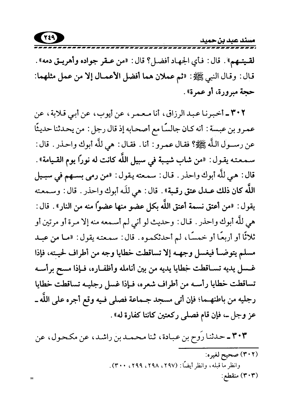 302- أَخْبَرَنَا عَبْدُ الرَّزَّاقِ، أنا مَعْمَرٌ، عَنْ أَيُّوبَ، عَنْ أَبِي قِلَابَةَ، عَنْ عَمْرِو بْنِ عَبَسَةَ: أَنَّهُ كَانَ جَالِسًا مَعَ أَصْحَابِهِ إِذْ قَالَ رَجُلٌ: مَنْ يُحَدِّثُنَا حَدِيثًا عَنْ رَسُولِ اللَّهِ صَلَّى الله عليه وسلم؟ فقال عَمْرٌو: أَنَا. فَقَالَ: هِي لِلَّهِ أَبُوكَ وَاحْذَرْ. قَالَ: سَمِعْتُهُ يَقُولُ: "مَنْ شَابَ شَيْبَةً فِي سَبِيلِ اللَّهِ, كَانَتْ لَهُ نُورًا يَوْمَ الْقِيَامَةِ". قَالَ: هِي لِلَّهِ أَبُوكَ وَاحْذَرْ. قَالَ: سَمِعْتُهُ يَقُولُ: "مَنْ رَمَى بِسَهْمٍ فِي سَبِيلِ اللَّهِ, كَانَ ذَلِكَ عِدْلِ عِتْقِ رَقَبَةٍ". قَالَ: هِي لِلَّهِ أَبُوكَ وَاحْذَرْ. قَالَ: وَسَمِعْتُهُ يَقُولُ: "مَنْ أَعْتَقَ نَسَمَةً, أَعْتَقَ اللَّهُ بِكُلِّ عُضْوٍ مِنْهَا عُضْوًا مِنْهُ مِنَ النَّارِ". قَالَ: هِي لِلَّهِ أَبُوكَ وَاحْذَرْ. قَالَ: وَحَدِيثٌ لَوْ أَنِّي لَمْ أَسْمَعْهُ مِنْهُ إِلَّا مَرَّةً أَوْ مَرَّتَيْنِ أَوْ ثَلَاثًا أَوْ أَرْبَعًا أَوْ خَمْسًا، لَمْ أُحَدِّثْكُمُوهُ. قَالَ: سَمِعْتُهُ يَقُولُ: "مَا مِنْ عَبْدٍ مُسْلِمٍ يَتَوَضَّأُ فَيَغْسِلُ وَجْهَهُ إِلَّا تَسَاقَطَتْ خَطَايَا وَجْهِهِ مِنْ أَطْرَافِ لِحْيَتِهِ، فَإِذَا غَسَلَ يَدَيْهِ تَسَاقَطَتْ خَطَايَا يَدَيْهِ مِنْ بَيْنِ أَنَامِلِهِ وَأَظْفَارِهِ، فَإِذَا مَسَحَ بِرَأْسِهِ تَسَاقَطَتْ خَطَايَا رَأْسِهِ مِنْ أَطْرَافِ شَعْرِهِ، فَإِذَا غَسَلَ رِجْلَيْهِ تَسَاقَطَتْ خَطَايَا رِجْلَيْهِ مِنْ بَاطِنِهِمَا؛ فَإِنْ أَتَى مسجد جماعة فصلى فيه, وَقَعَ أَجْرُهُ عَلَى اللَّهِ عَزَّ وَجَلَّ, فَإِنْ قَامَ فَصَلَّى رَكْعَتَيْنِ كَانَتَا كَفَّارَةً لَهُ".
