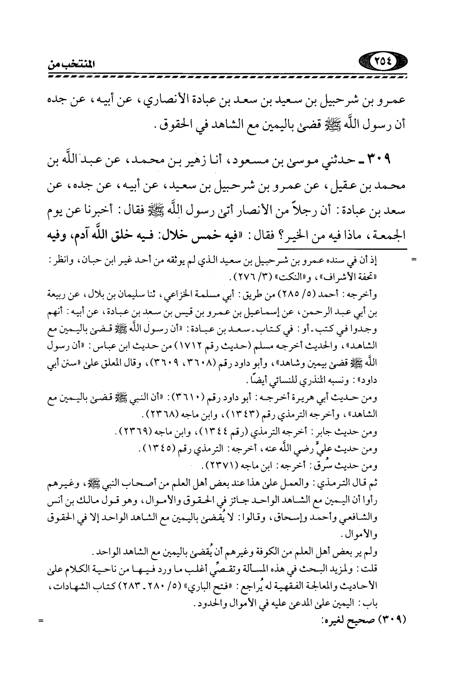 وأخرجه: أحمد "5/ 285" من طريق: أبي مسلمة الخزاعي، ثَنَا سُلَيْمَانُ بْنُ بِلَالٍ، عَنْ رَبِيعَةَ بْنِ أَبِي عَبْدِ الرَّحْمَنِ، عن إسماعيل بن عمرو بن قيس بن سعد بن عبادة، عن أبيه: أنهم وجدوا في كتب -أو: في كتاب- سَعْدِ بْنِ عُبَادَةَ: "أَنَّ رَسُولَ اللَّهِ -صَلَّى اللهُ عَلَيْهِ وَسَلَّمَ- قضى باليمين مع الشاهد"، والحديث أخرجه مسلم "حديث رقم 1712" من حديث ابْنِ عَبَّاسٍ: "أَنَّ رَسُولَ اللَّهِ -صَلَّى اللهُ عَلَيْهِ وَسَلَّمَ- قَضَى بيمين وشاهد"، وأبو داود رقم "3608، 3609"، وقال المعلق على "سنن أبي داود": ونسبه المنذري للنسائي أيضا.