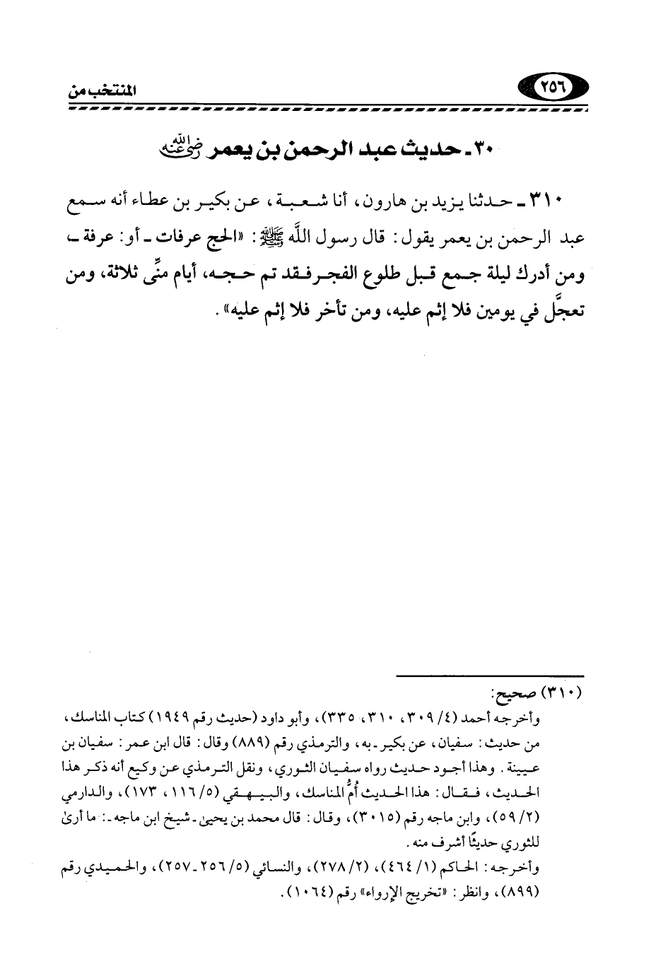 310- حَدَّثَنَا يَزِيدُ بْنُ هَارُونَ، أنا شُعْبَةُ، عَنْ بُكَيْرِ بْنِ عَطَاءٍ أَنَّهُ سَمِعَ عَبْدَ الرَّحْمَنِ بْنِ يَعْمَرَ يَقُولُ: قَالَ رَسُولُ اللَّهِ, صَلَّى اللهُ عَلَيْهِ وَسَلَّمَ: "الْحَجُّ عَرَفَاتٌ -أَوْ: عَرَفَةُ- وَمَنْ أَدْرَكَ لَيْلَةَ جَمْعٍ قَبْلَ طُلُوعِ الْفَجْرِ فَقَدْ تَمَّ حَجُّهُ، أَيَّامُ مِنًى ثَلَاثَةٌ، وَمَنْ تَعَجَّلَ فِي يَوْمَيْنِ فَلَا إِثْمَ عَلَيْهِ، وَمَنْ تَأَخَّرَ فَلَا إِثْمَ عليه".