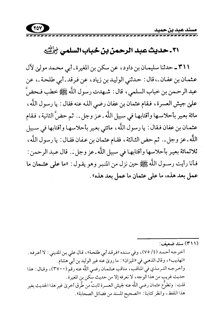 311- حَدَّثَنَا سُلَيْمَانُ بْنُ دَاوُدَ، عَنْ سَكَنِ بْنِ الْمُغِيرَةِ -أَبِي مُحَمَّدٍ, مَوْلًى لِآلِ عُثْمَانَ بْنِ عَفَّانَ- قَالَ: حَدَّثَنِي الْوَلِيدُ بْنُ زِيَادٍ، عَنْ فَرْقَدٍ -أَبِي طَلْحَةَ- عَنْ عَبْدِ الرَّحْمَنِ بْنِ خَبَّابٍ السُّلَمِيِّ، قَالَ: شَهِدْتُ رَسُولَ اللَّهِ -صَلَّى اللهُ عَلَيْهِ وَسَلَّمَ- خَطَبَ, فَحَضَّ عَلَى جَيْشِ الْعُسْرَةِ، فَقَامَ عُثْمَانُ بْنُ عَفَّانَ -رَضِيَ اللَّهُ عَنْهُ- فَقَالَ: يَا رَسُولَ اللَّهِ، مِائَةُ بَعِيرٍ بِأَحْلَاسِهَا وَأَقْتَابِهَا فِي سَبِيلِ اللَّهِ عَزَّ وَجَلَّ. ثُمَّ حَضَّ الثَّانِيَةَ، فَقَامَ عُثْمَانُ بْنُ عَفَّانَ فَقَالَ: يا رسول الله، مائتا بَعِيرٍ بِأَحْلَاسِهَا وَأَقْتَابِهَا فِي سَبِيلِ اللَّهِ عَزَّ وَجَلَّ. ثُمَّ حَضَّ الثَّالِثَةَ، فَقَامَ عُثْمَانُ بْنُ عَفَّانَ فَقَالَ: يَا رَسُولَ اللَّهِ، ثَلَاثُمِائَةِ بَعِيرٍ بِأَحْلَاسِهَا وَأَقْتَابِهَا فِي سَبِيلِ اللَّهِ عَزَّ وَجَلَّ. قَالَ عَبْدُ الرَّحْمَنِ: فَأَنَا رَأَيْتُ رَسُولَ اللَّهِ -صَلَّى اللهُ عَلَيْهِ وَسَلَّمَ- حِينَ نَزَلَ مِنَ الْمِنْبَرِ, وَهُوَ يَقُولُ: "مَا عَلَى عُثْمَانَ مَا عَمِلَ بَعْدَ هَذِهِ، مَا عَلَى عُثْمَانَ ما عمل بعد هذه".